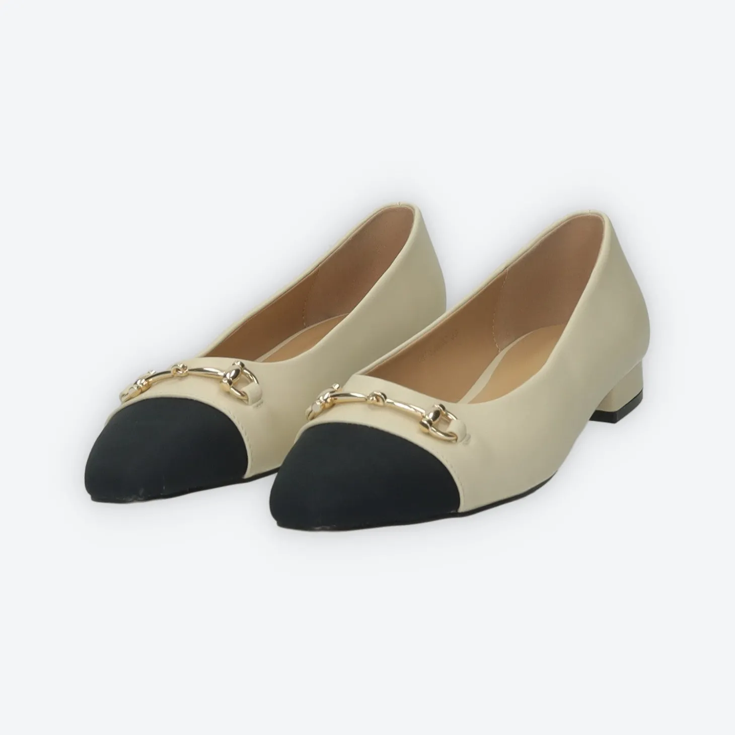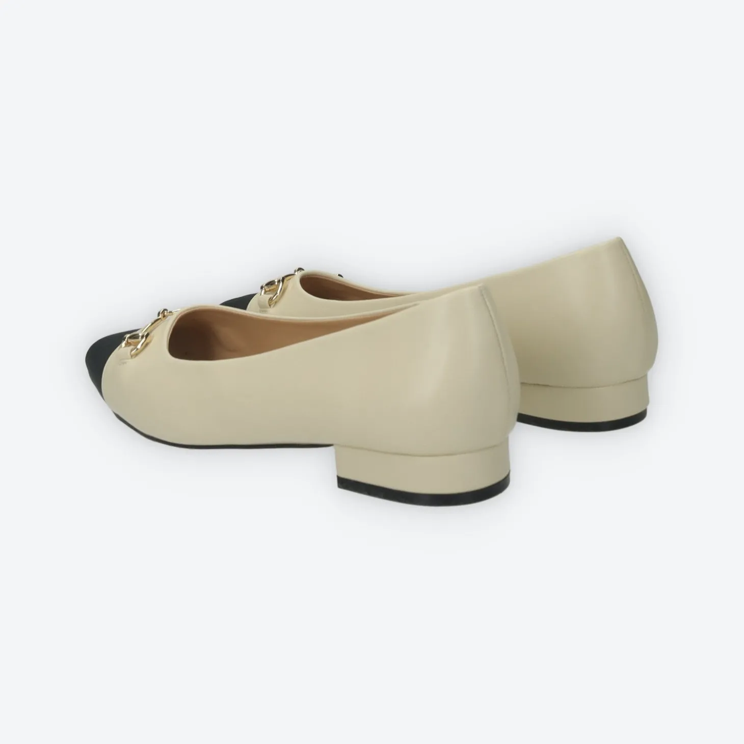 Ballerine a punta in ecopelle con morsetto sul davanti.Dettaglio contrasto sulla punta del piede.