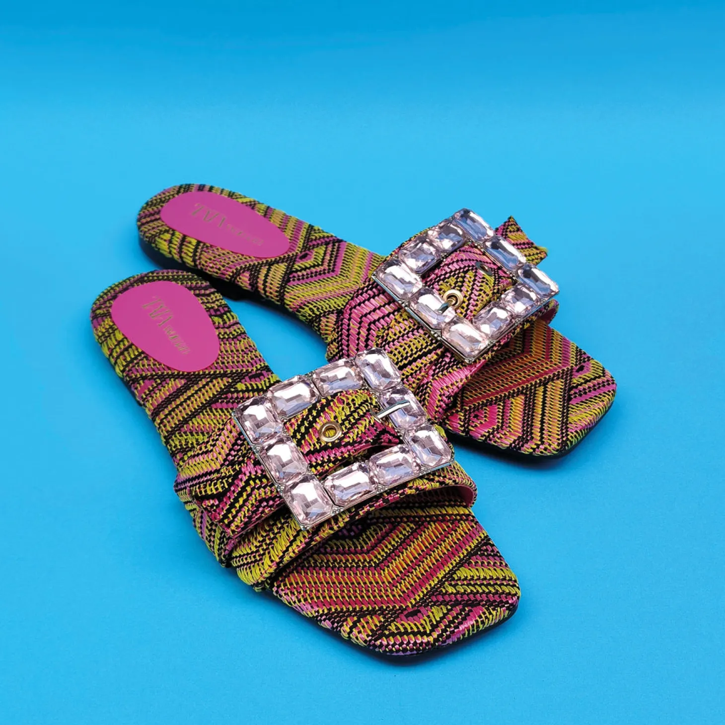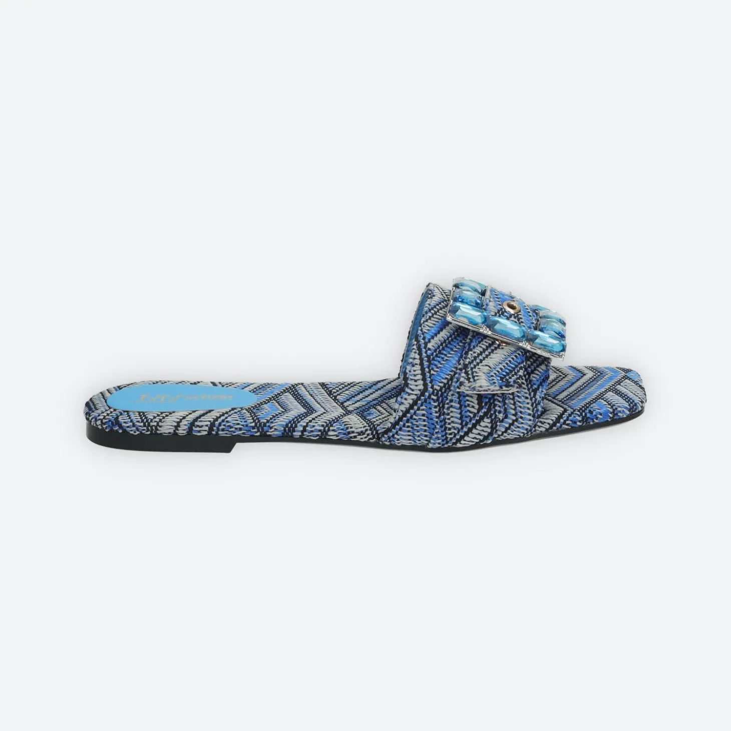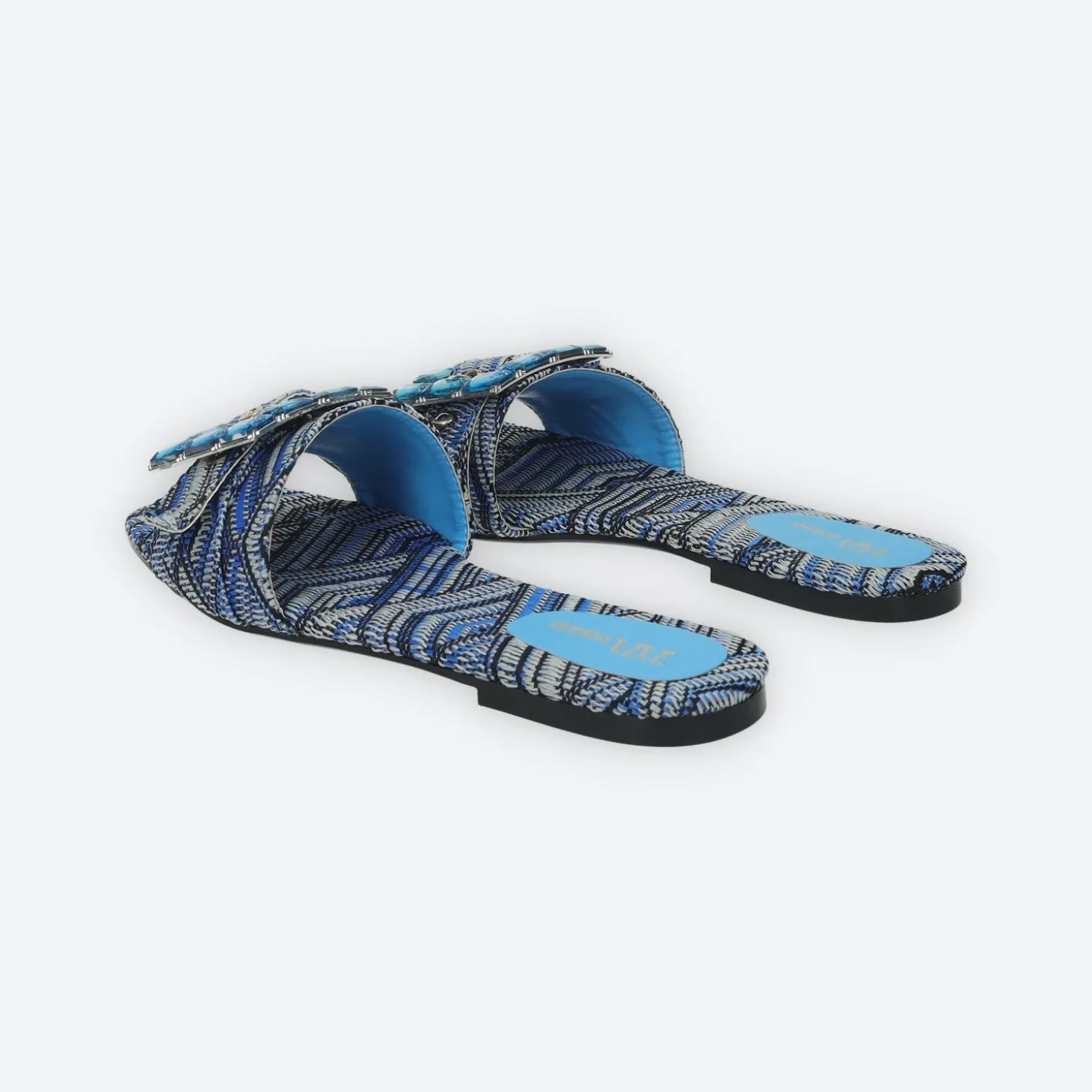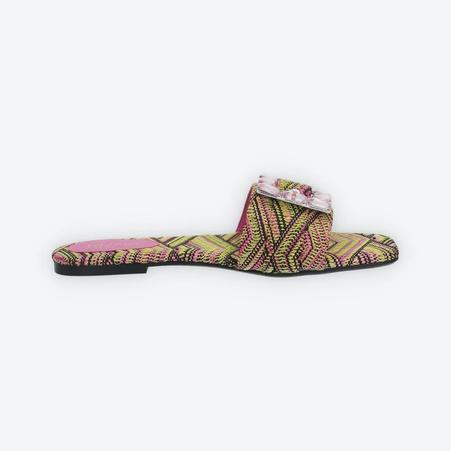 Sandali flat con citurino ricamato avvolgente.Dettaglio tessuto paglia