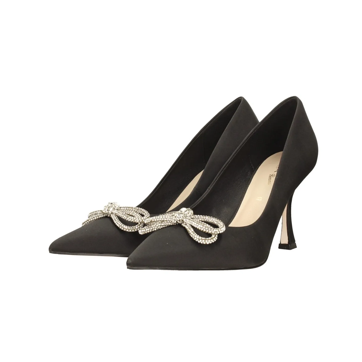 Décolleté in tessuto satin.. con fiocco tempestato di strass. Tacco alto 9cm