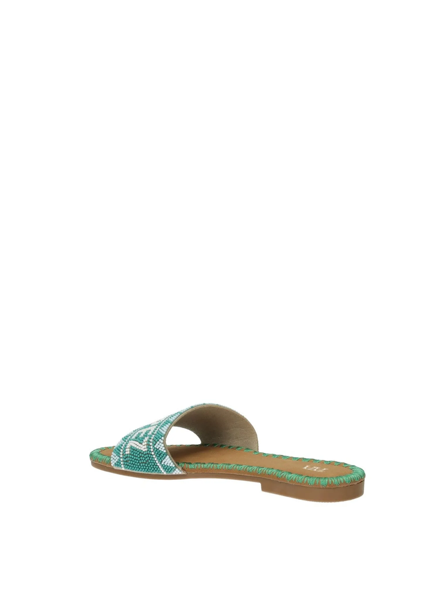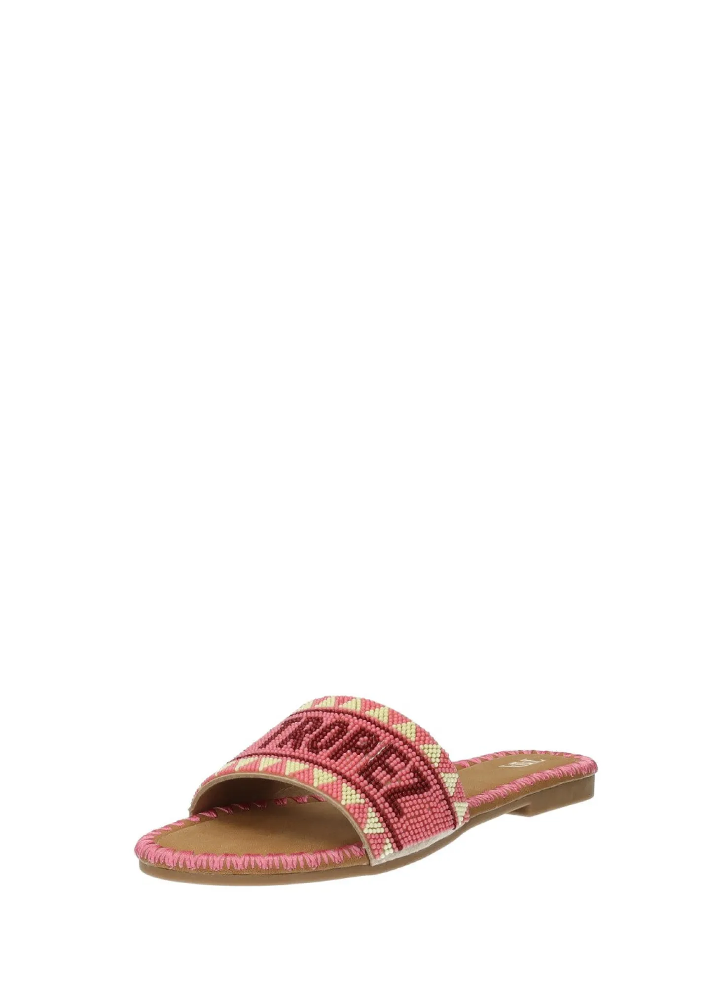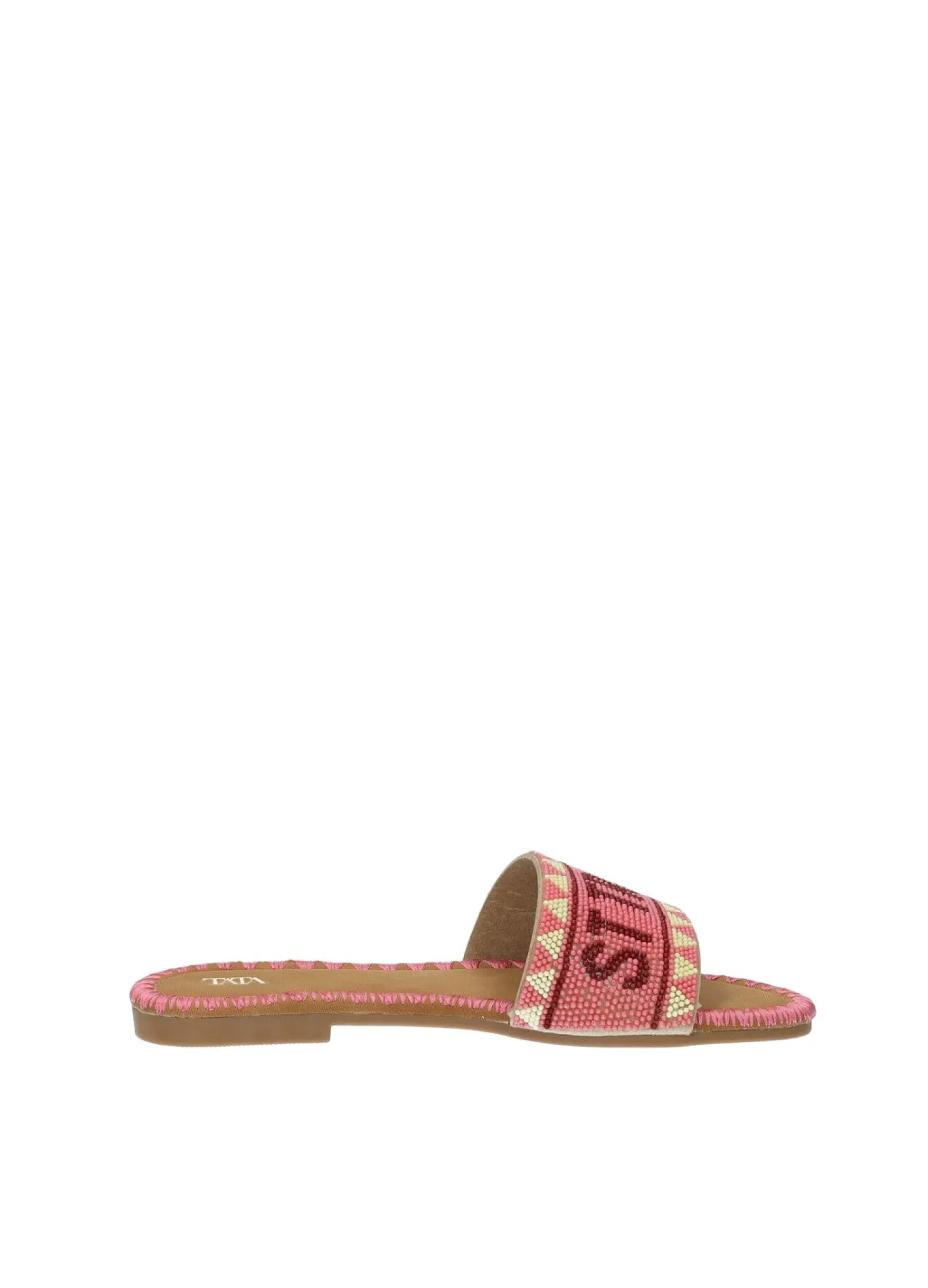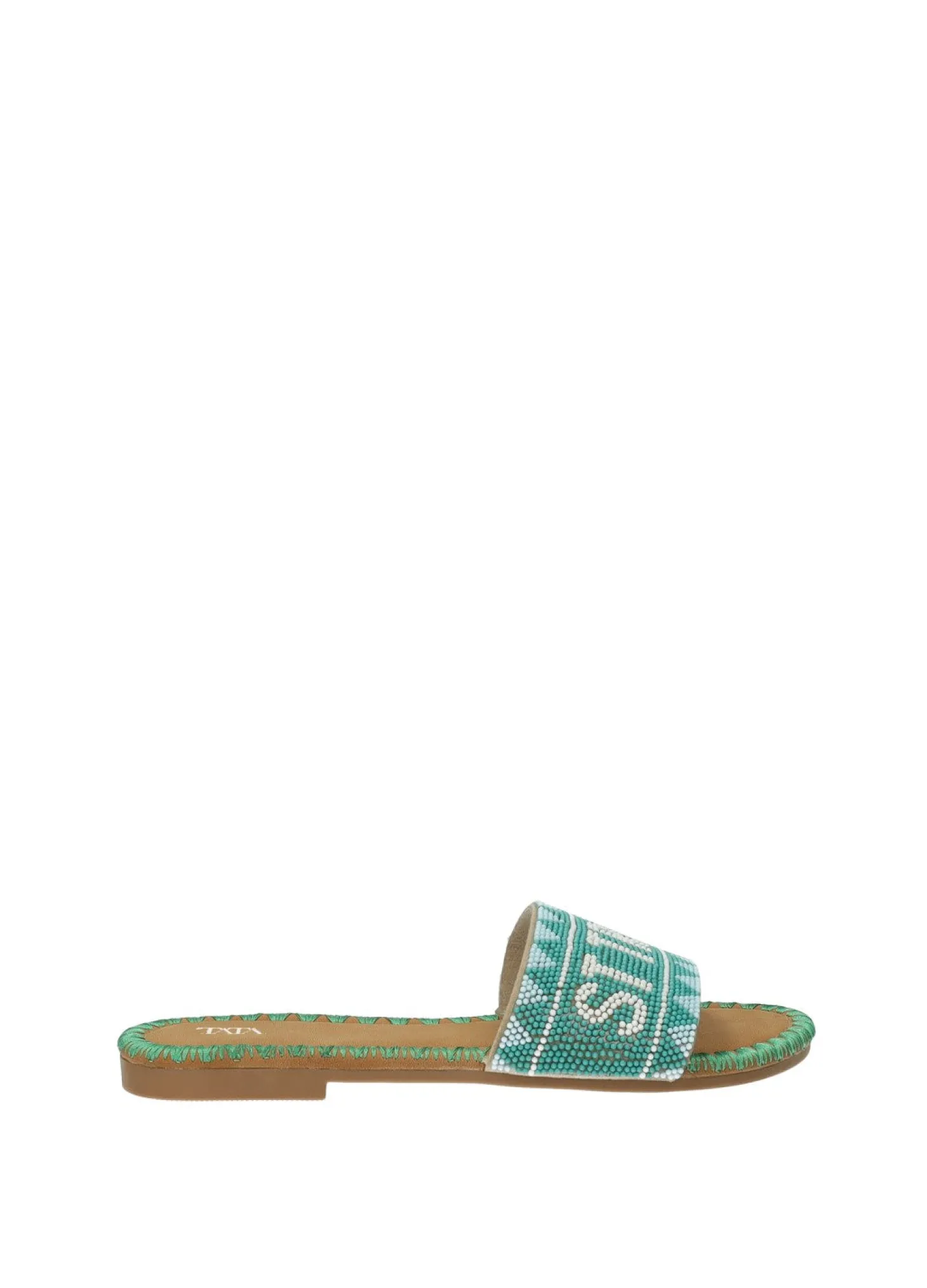 Sandali bassi con tomaia ricoperta di perline e fondo in gomma.ù