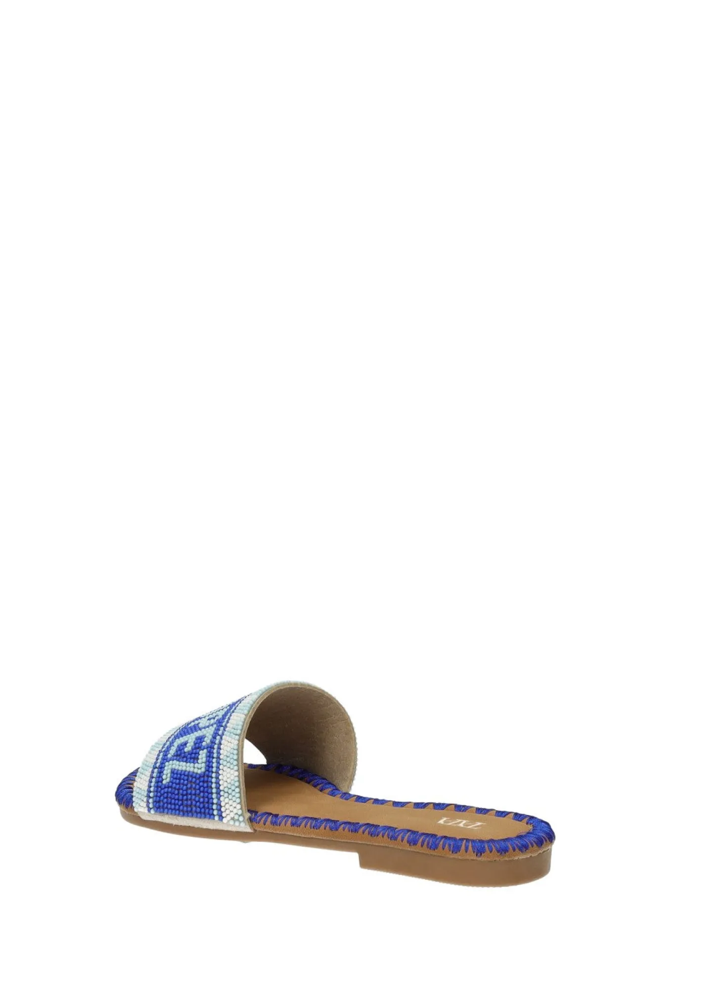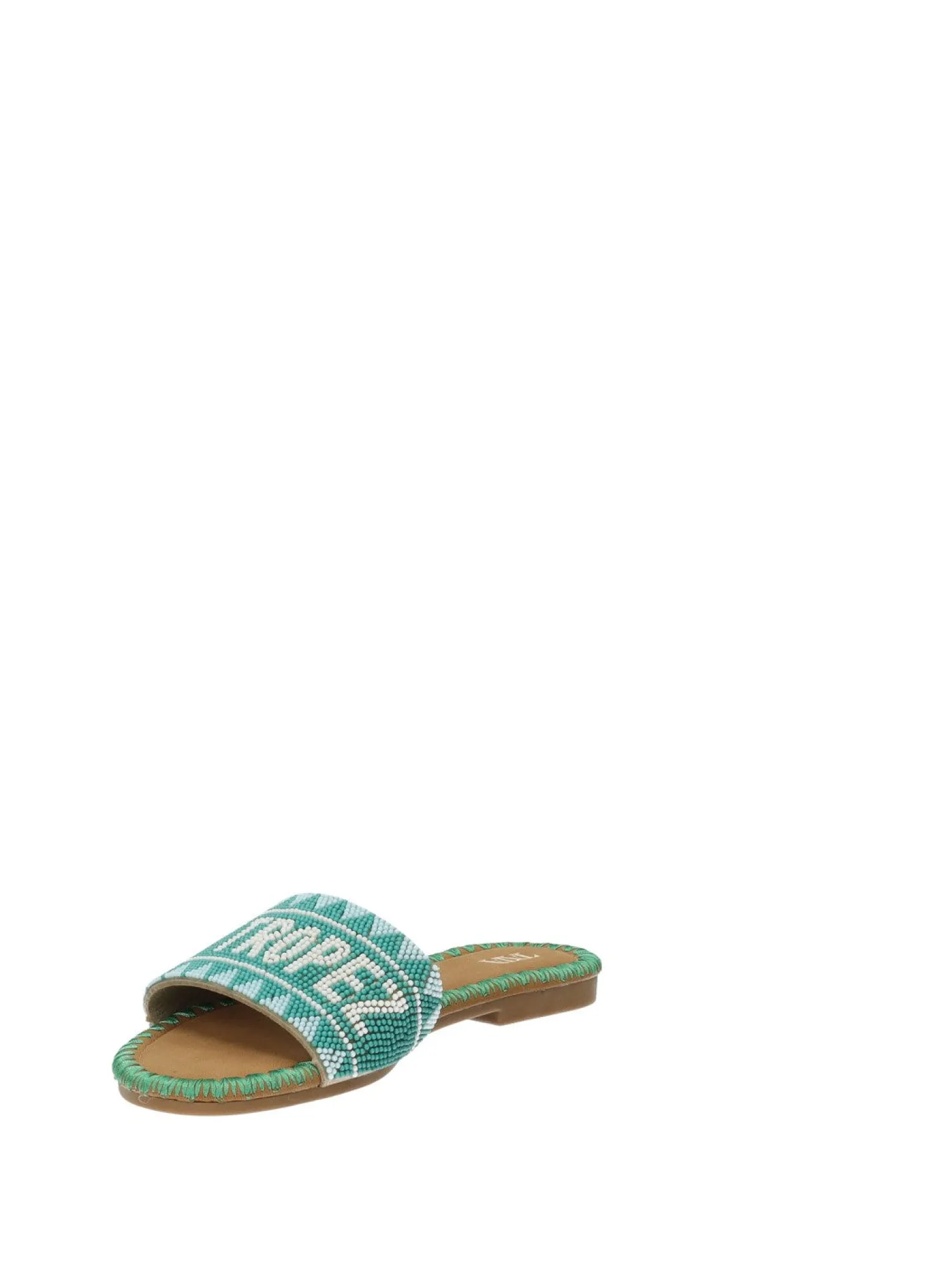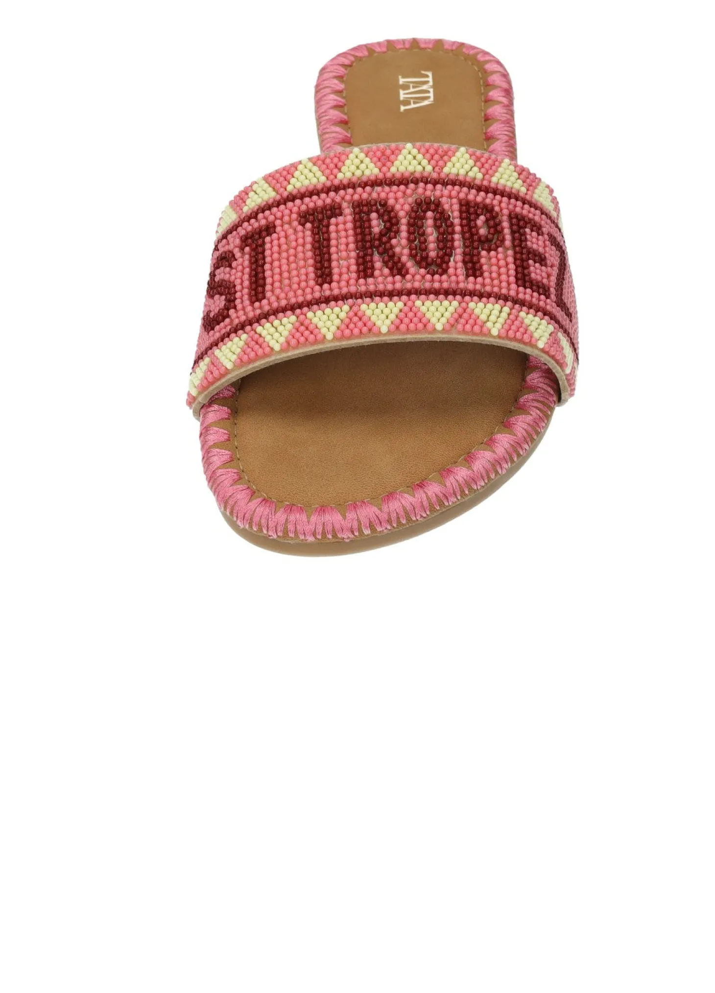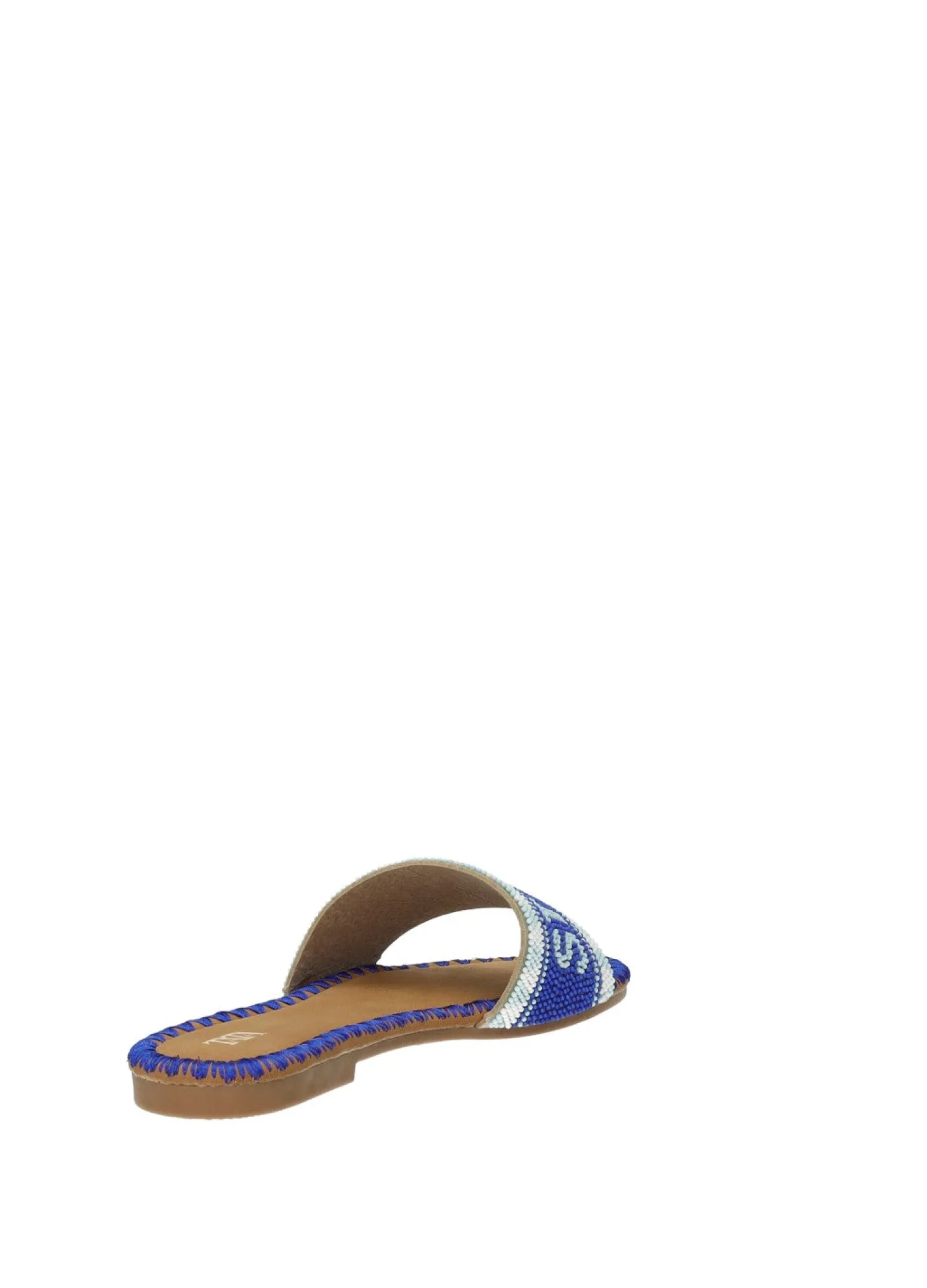 Sandali bassi con tomaia ricoperta di perline e fondo in gomma.ù