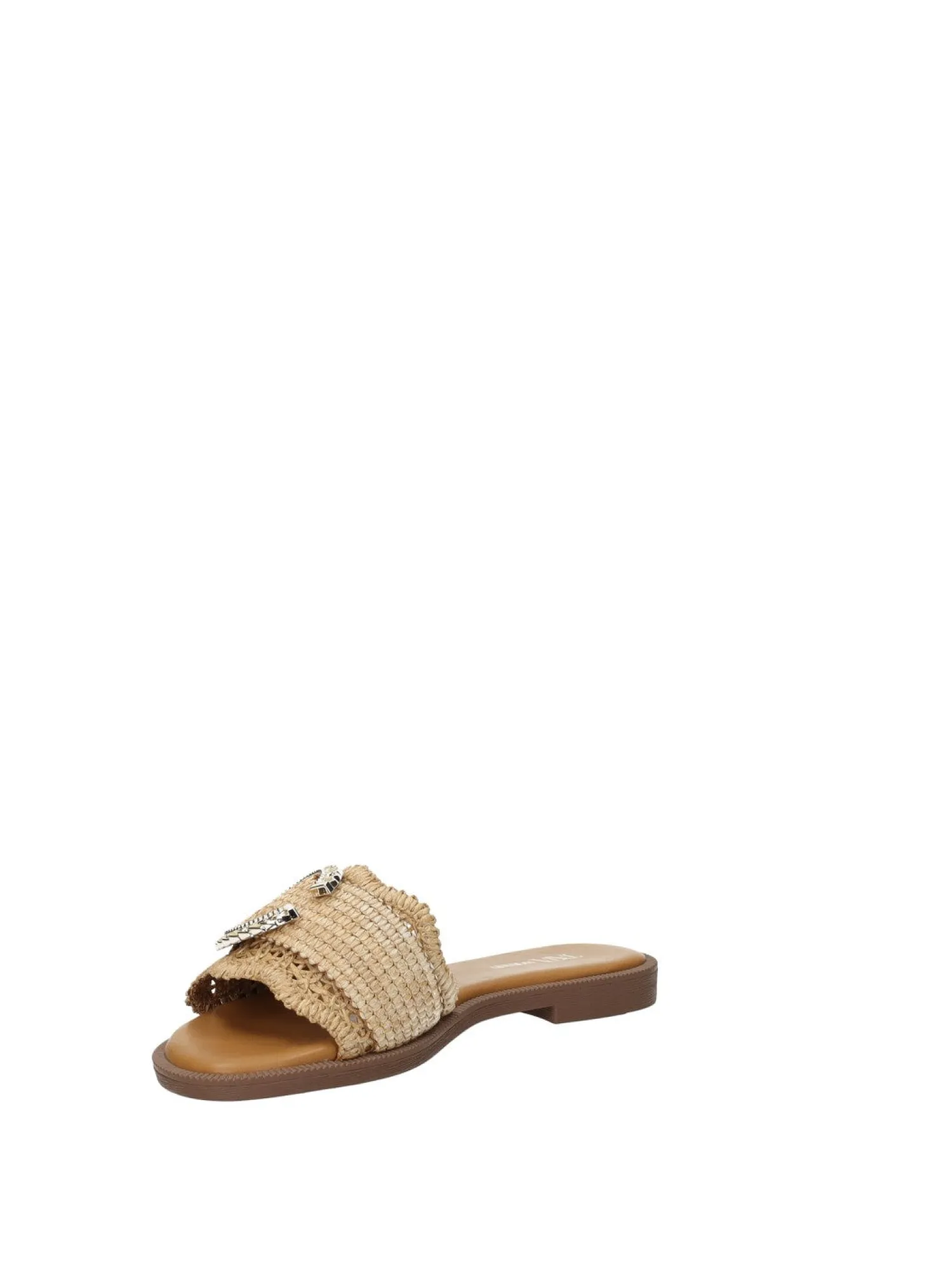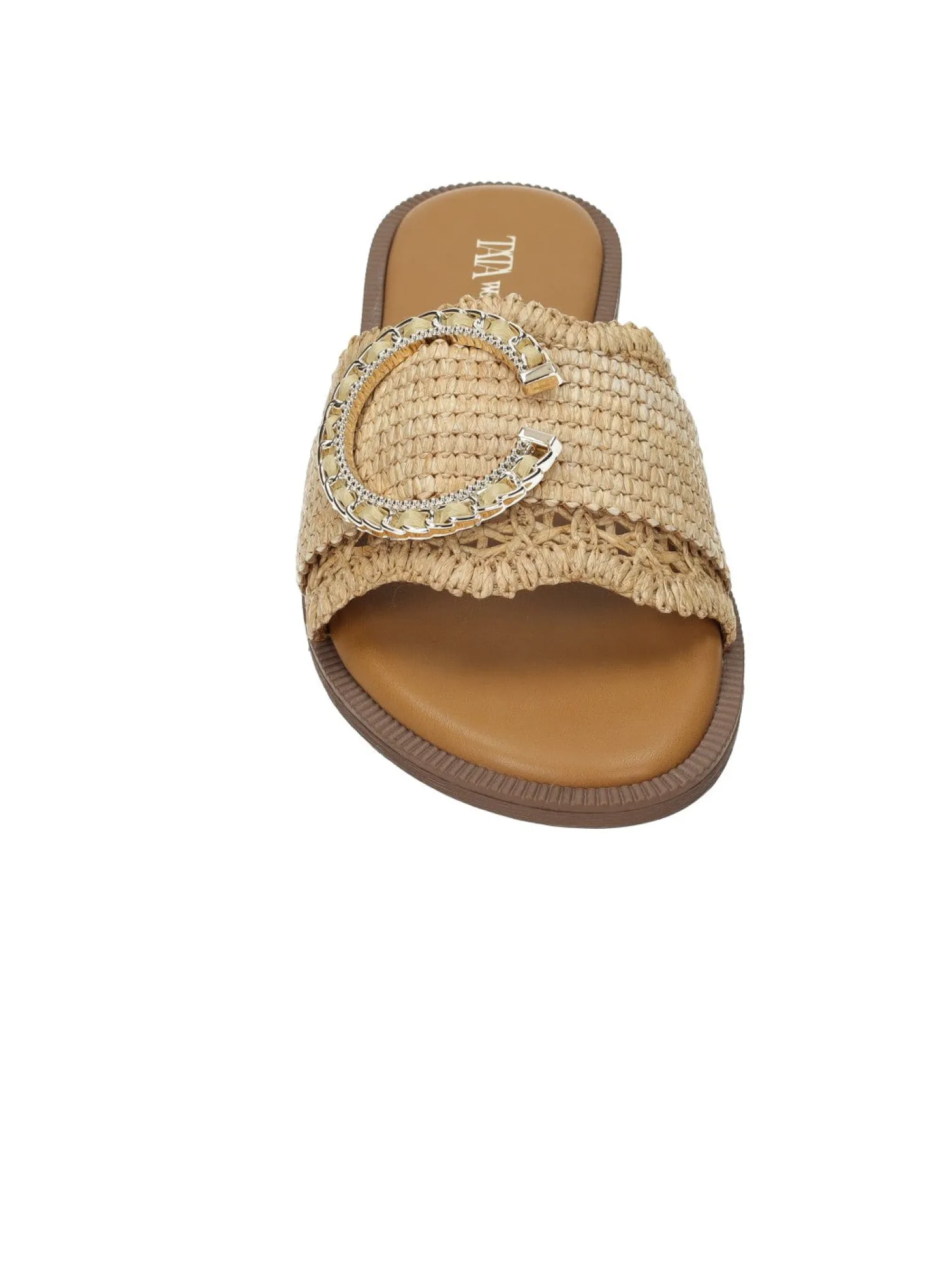 Sandali bassi con tomaia in rafia e dettaglio dorato.