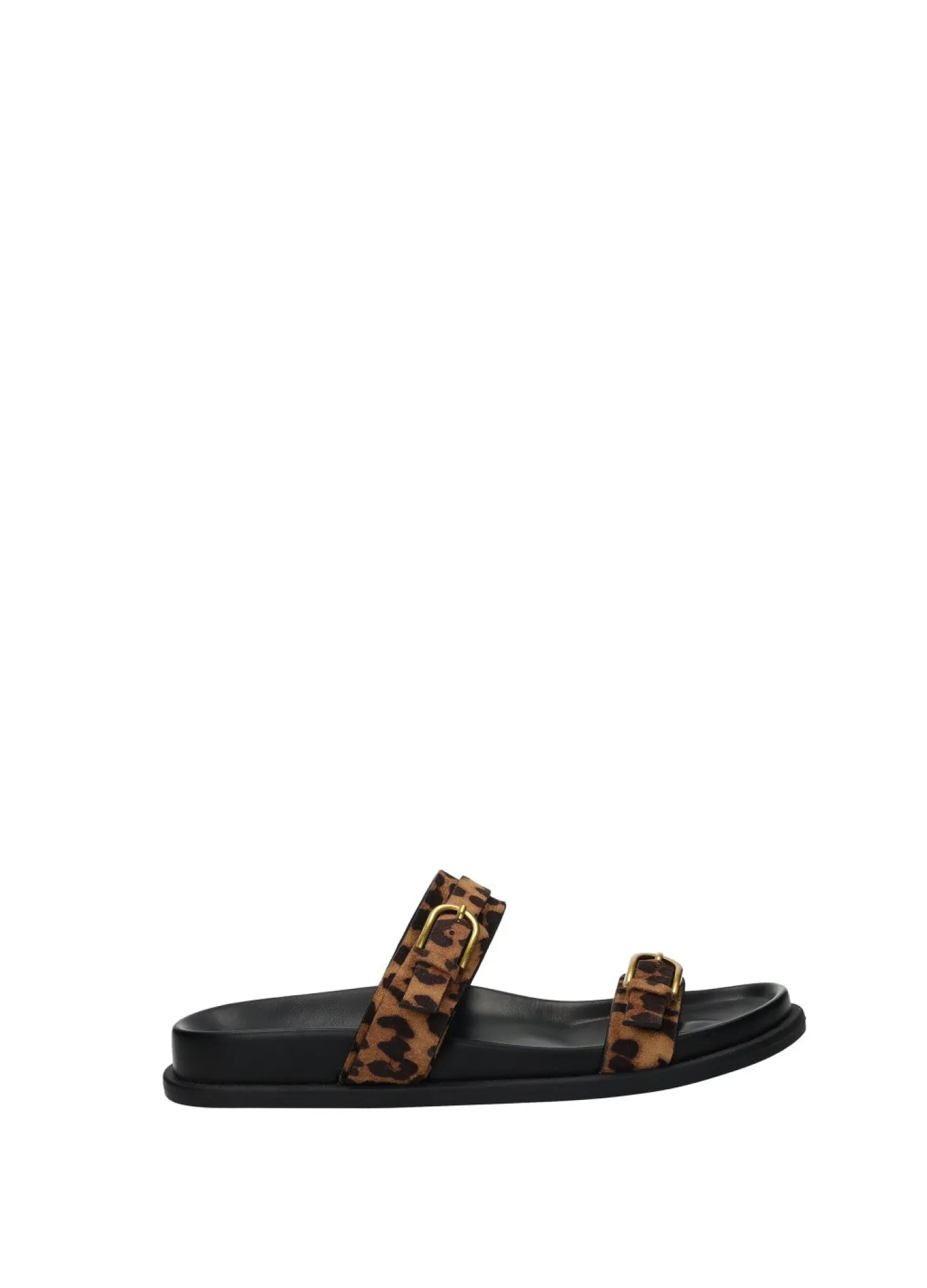 Sandali in microfibra con doppia fascia animalier e fondo in gomma.