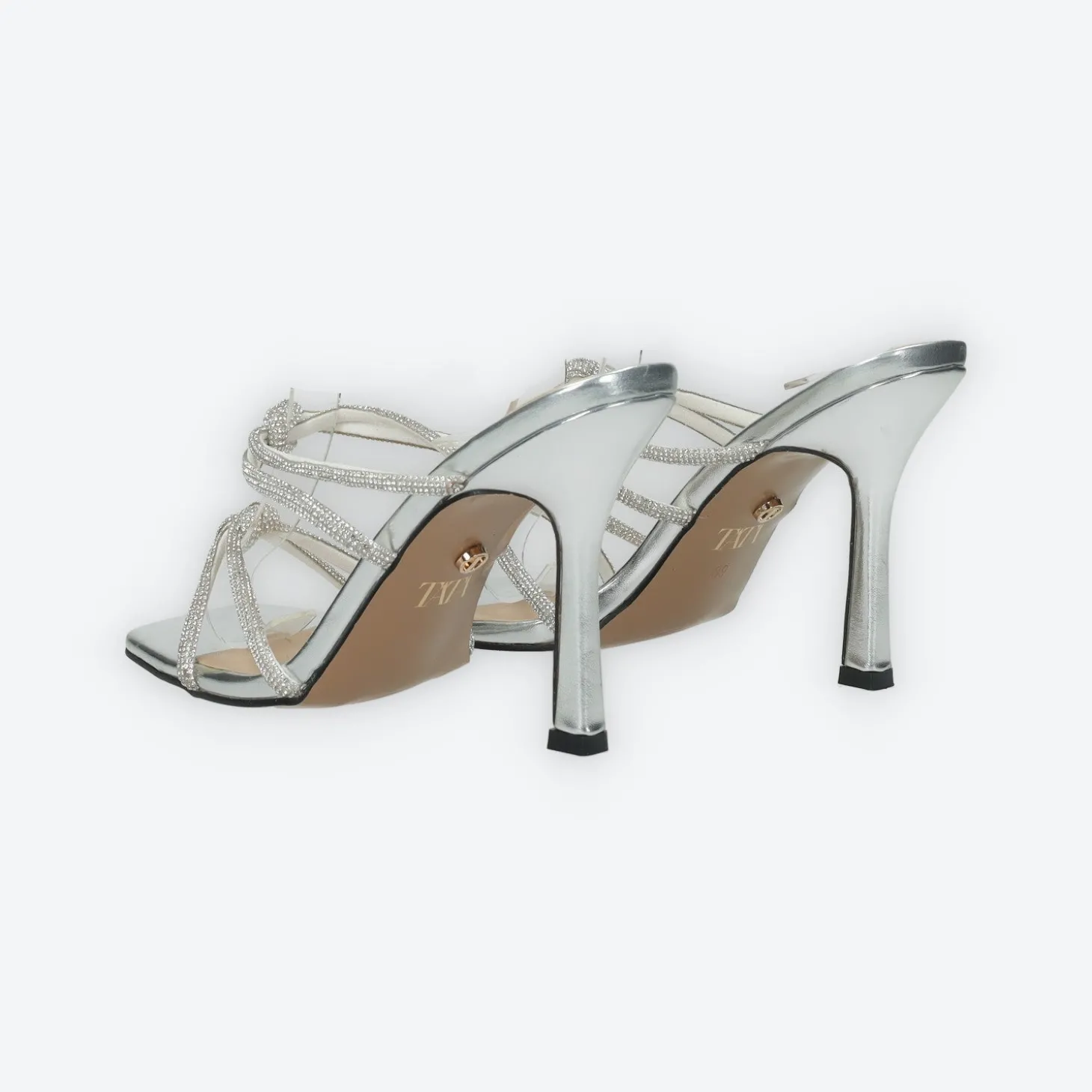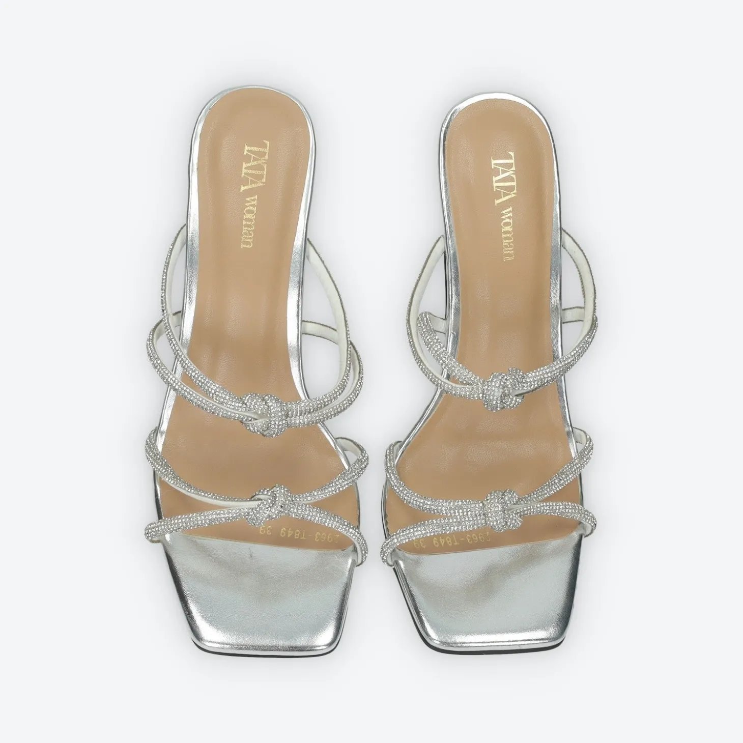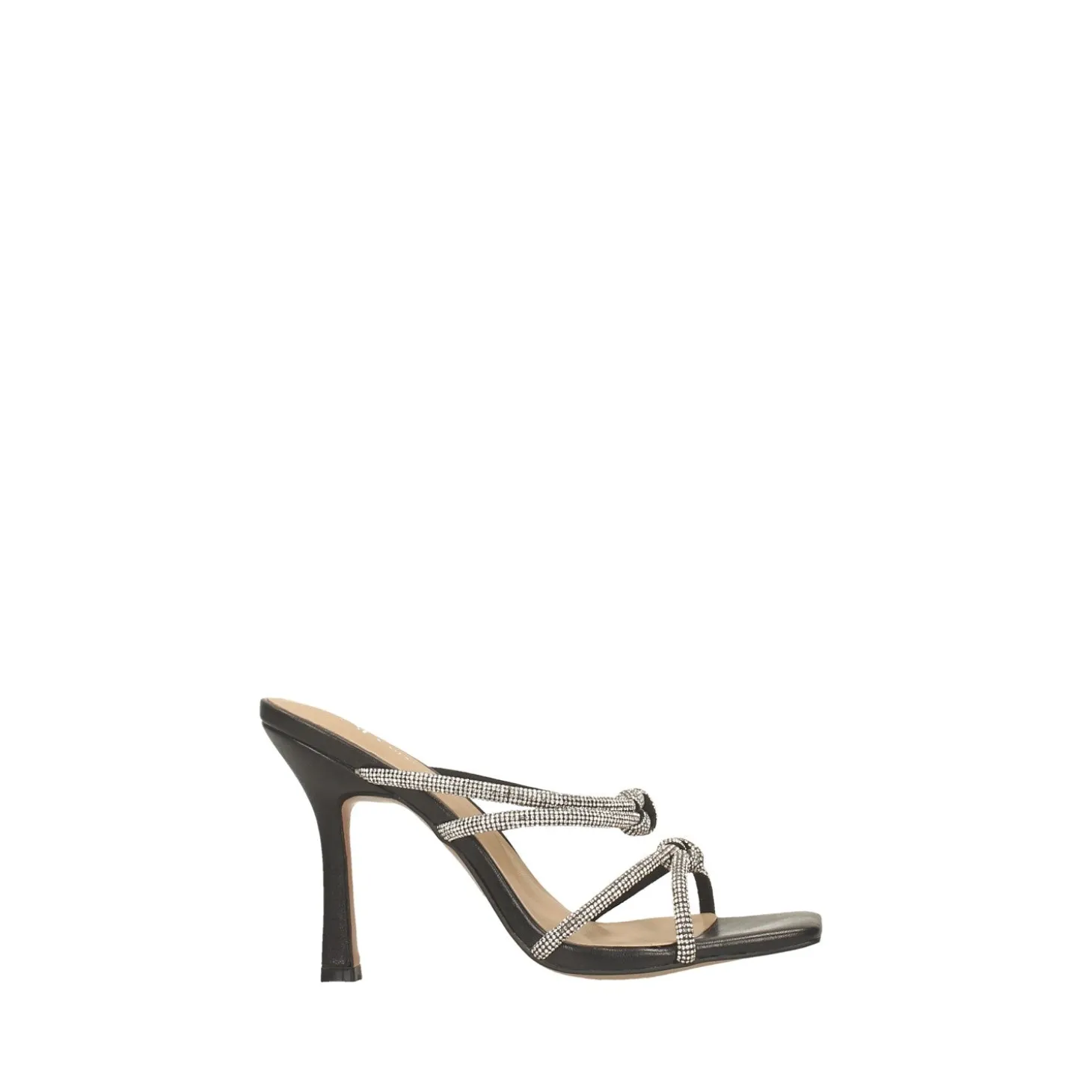 Sandali gioiello con listini a nodo.Tomaia ricoperta di strass luminosi.Altezza tacco: 10 cm.