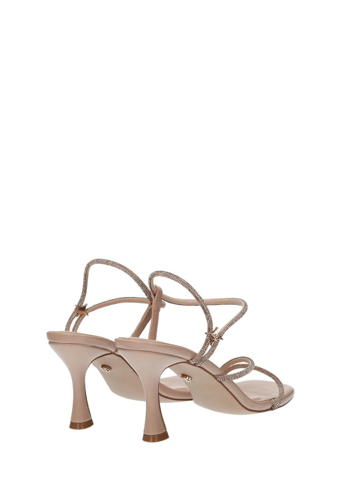 Sandali metallizzati con tacco di 8.5 cm e listini strass.