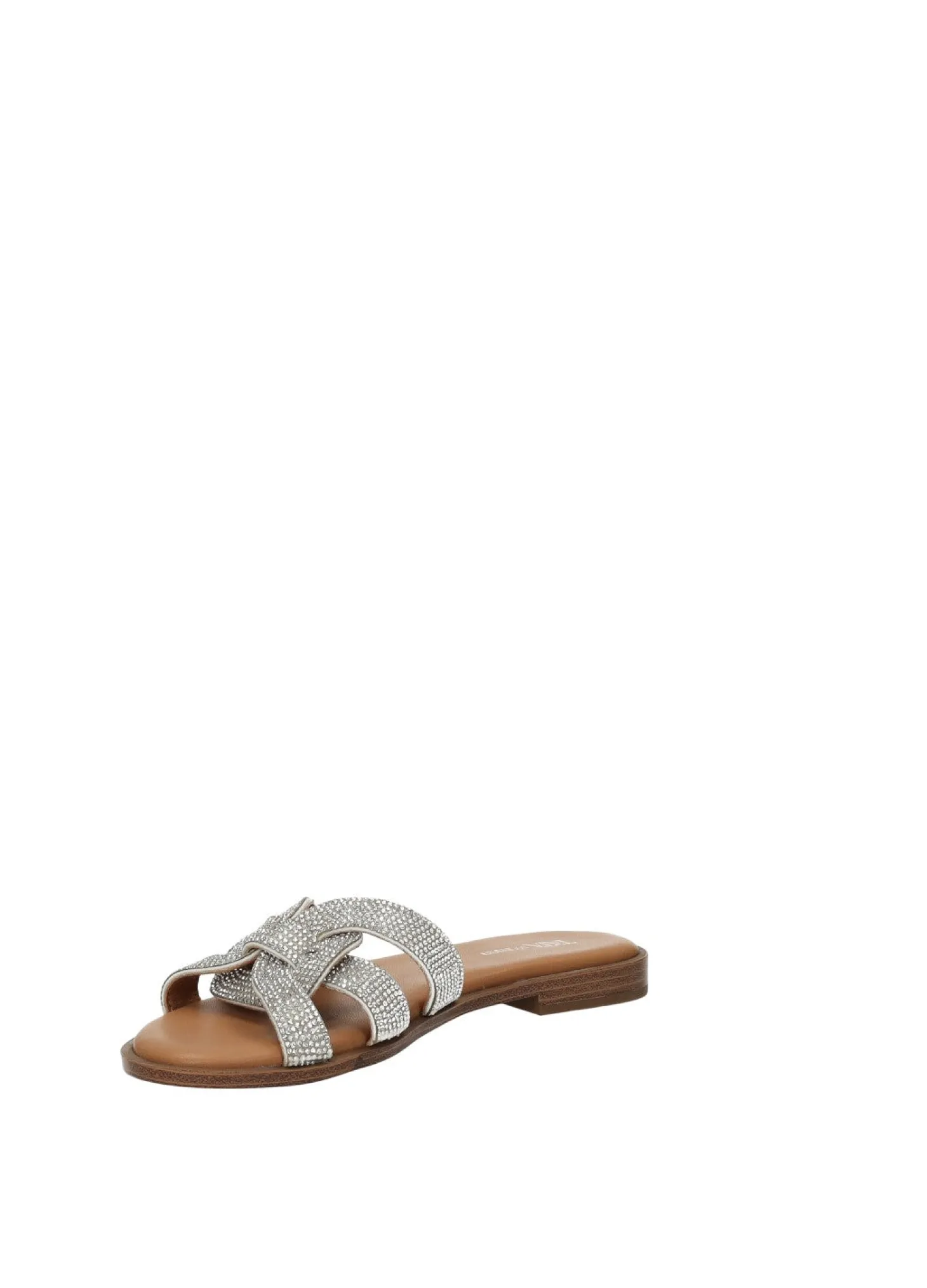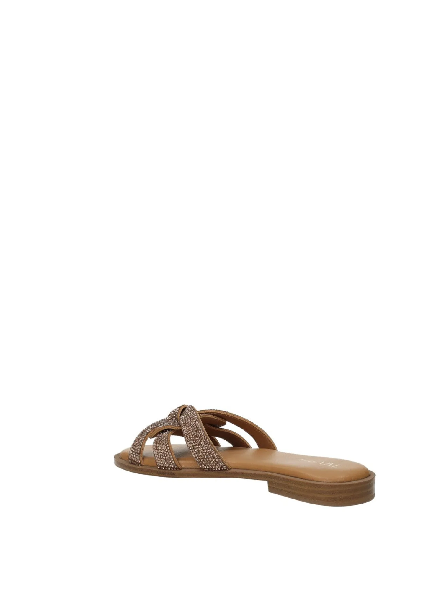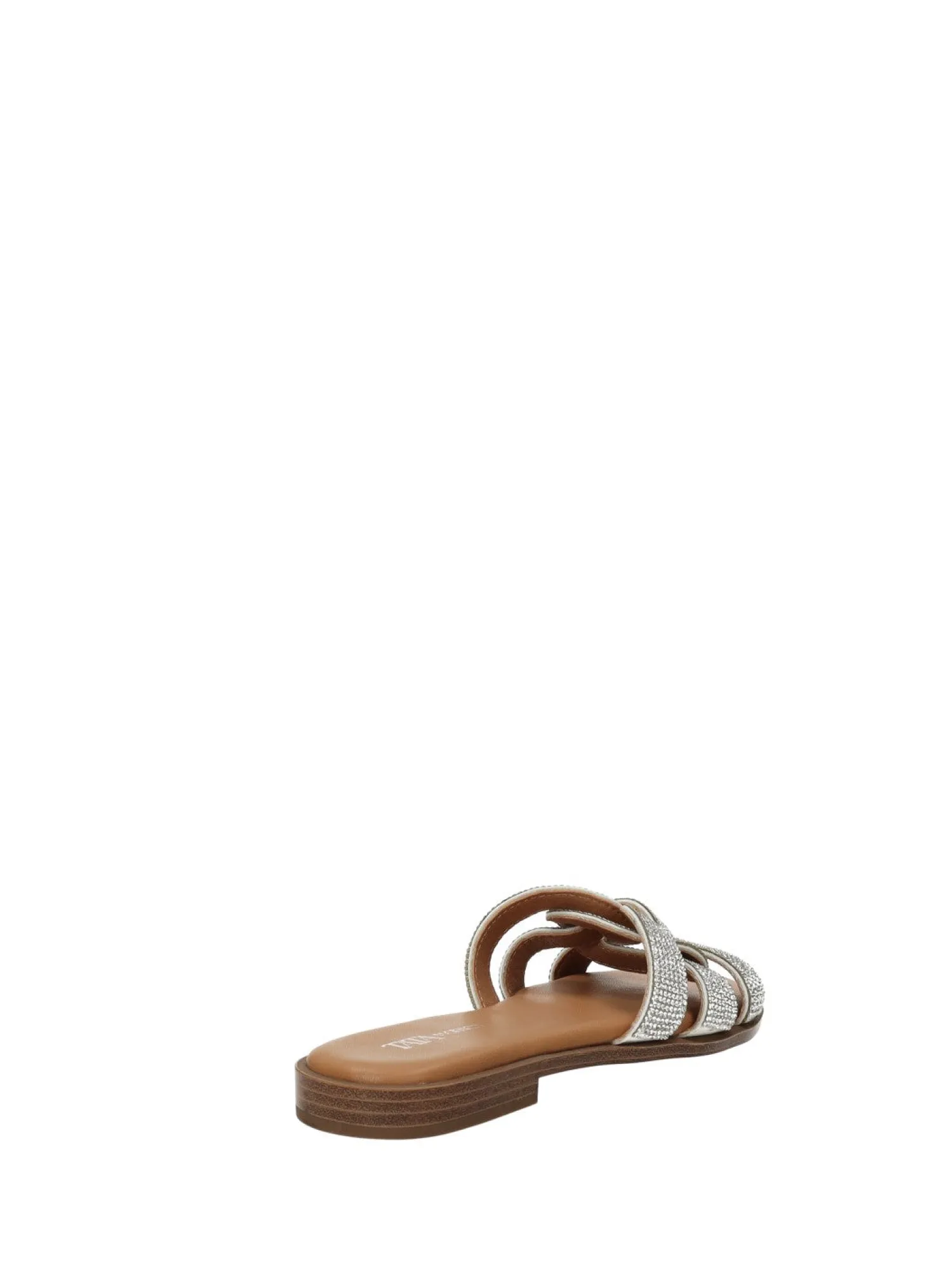 Sandali effetto pelle con tomaia ricoperta di strass e fondo in gomma.