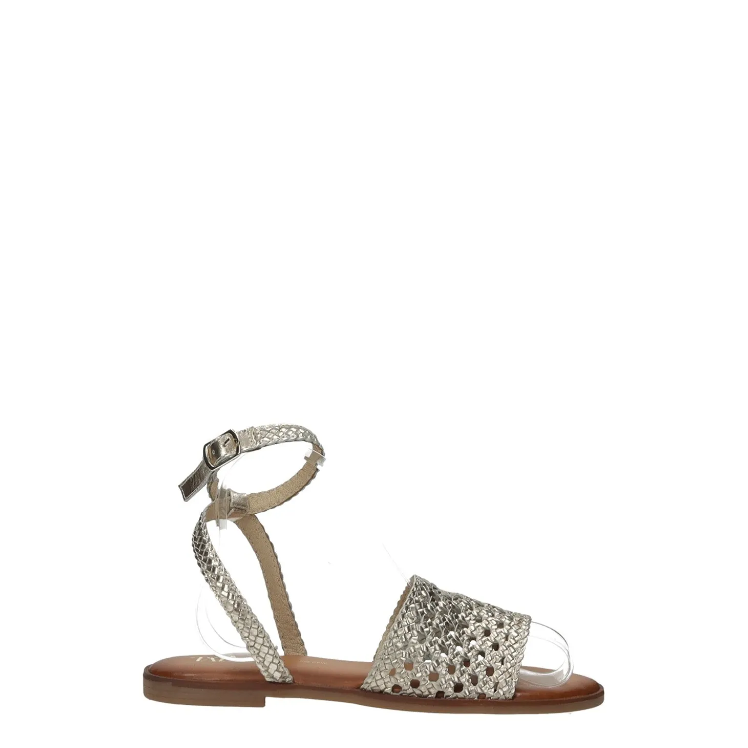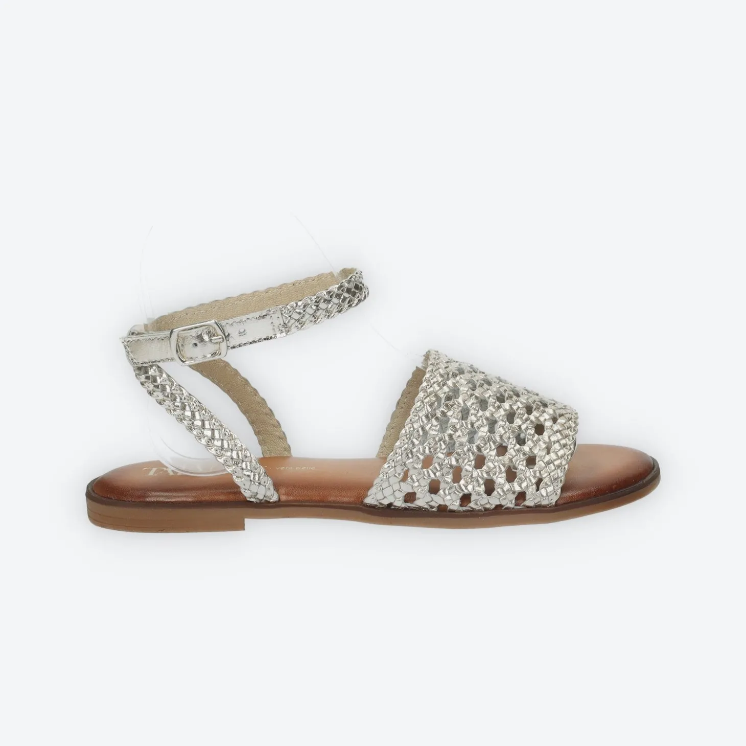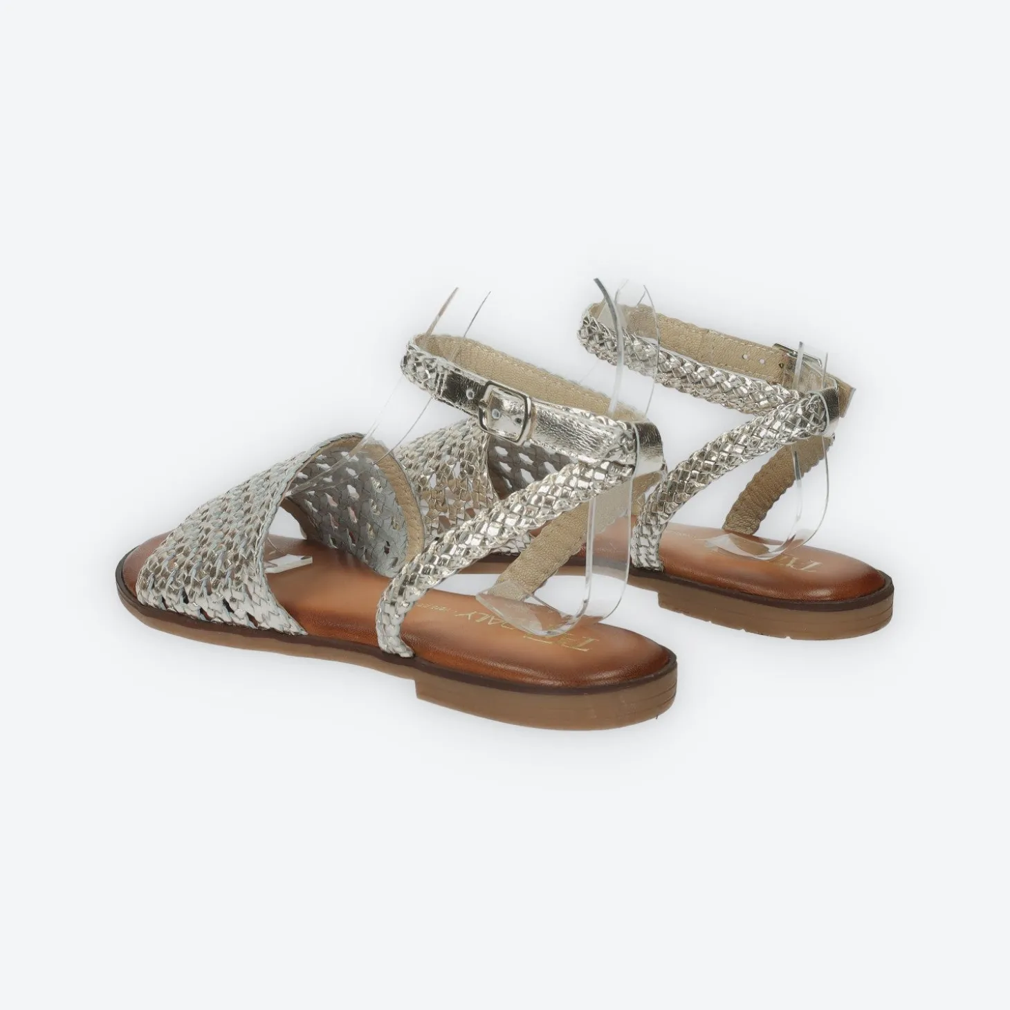 Sandali con trama intrecciata.Chiusura altezza caviglia.Sottopiede in vera pelle.