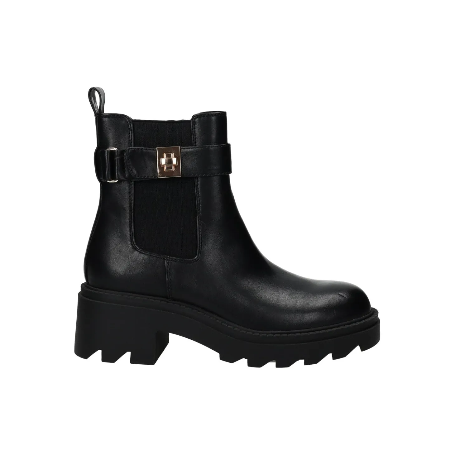 Stivaletti in ecopelle con fasce elasticizzate laterali e tirante sul retro e fibbia alla caviglia.