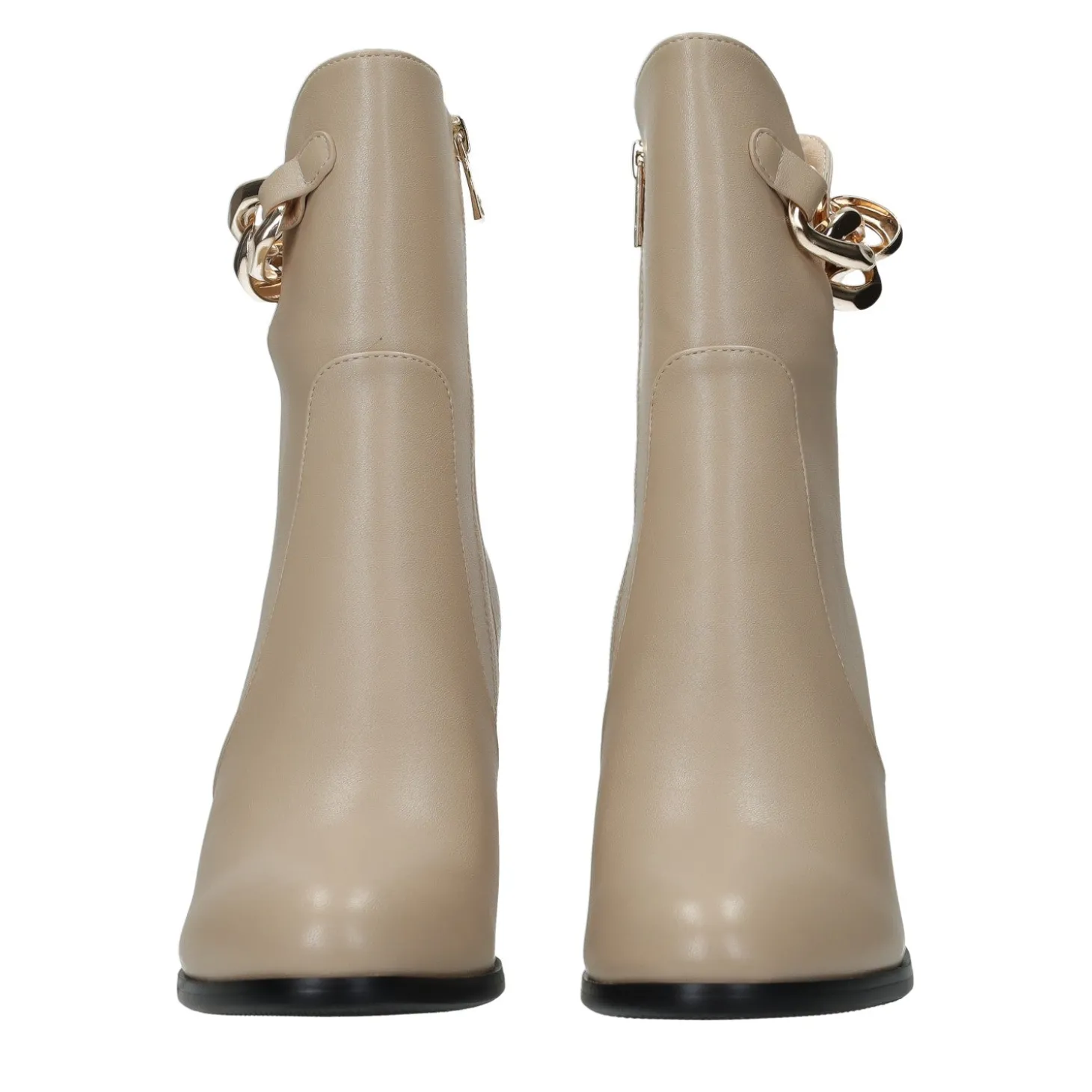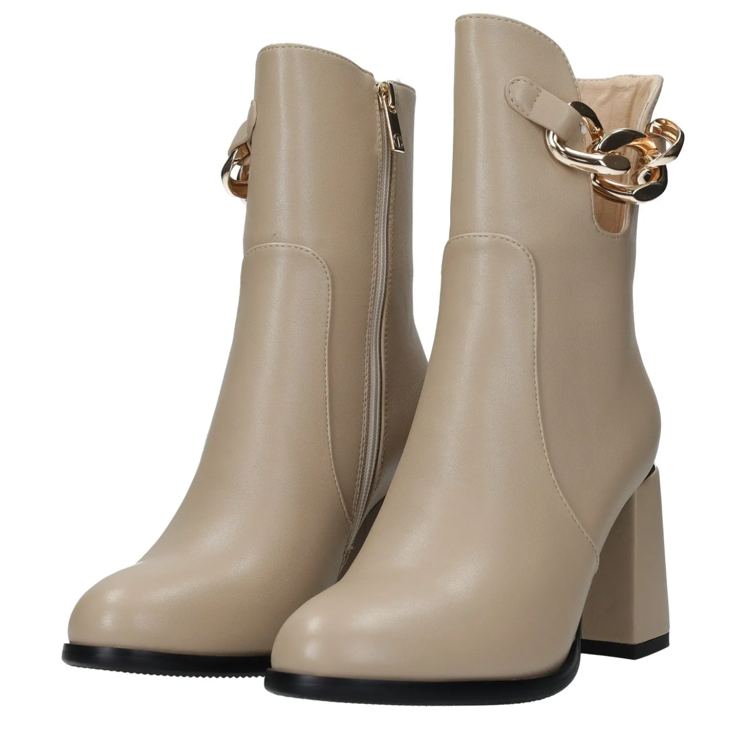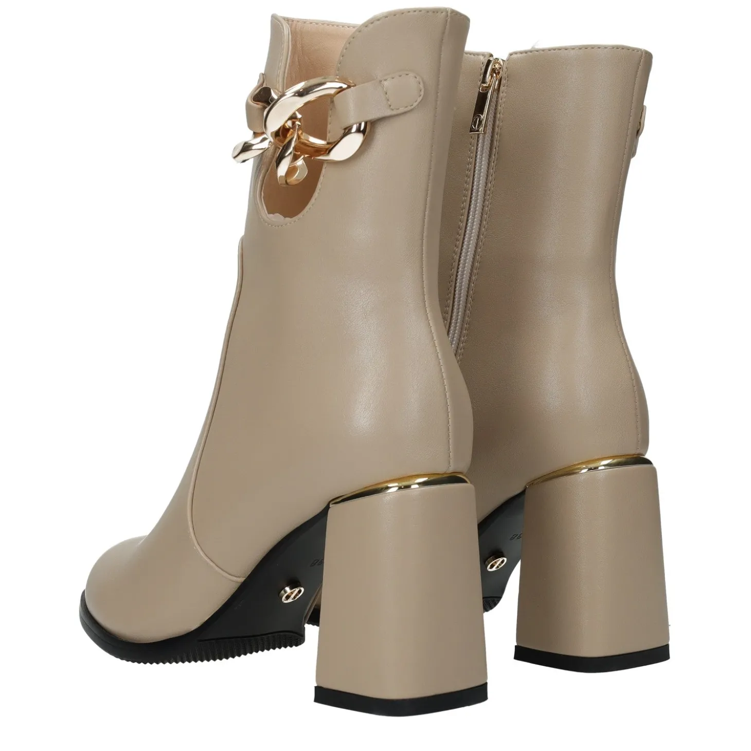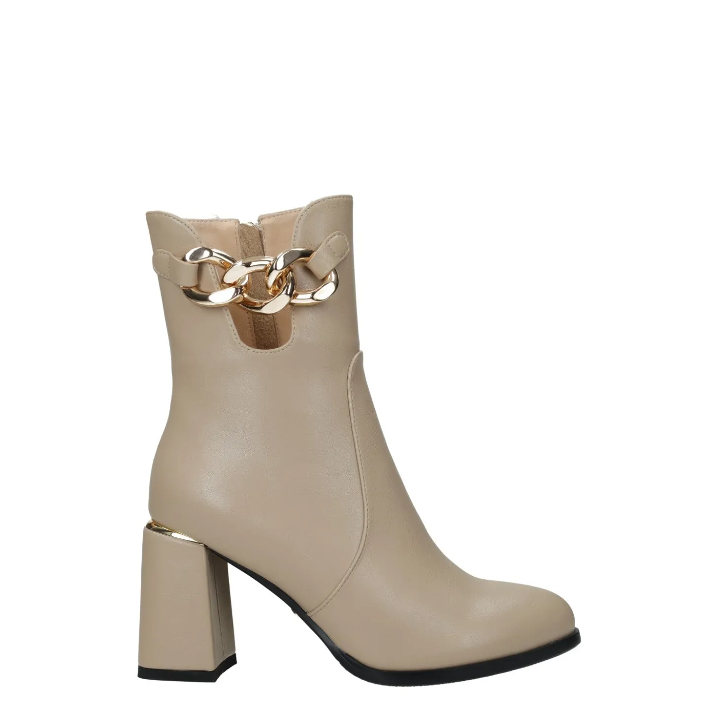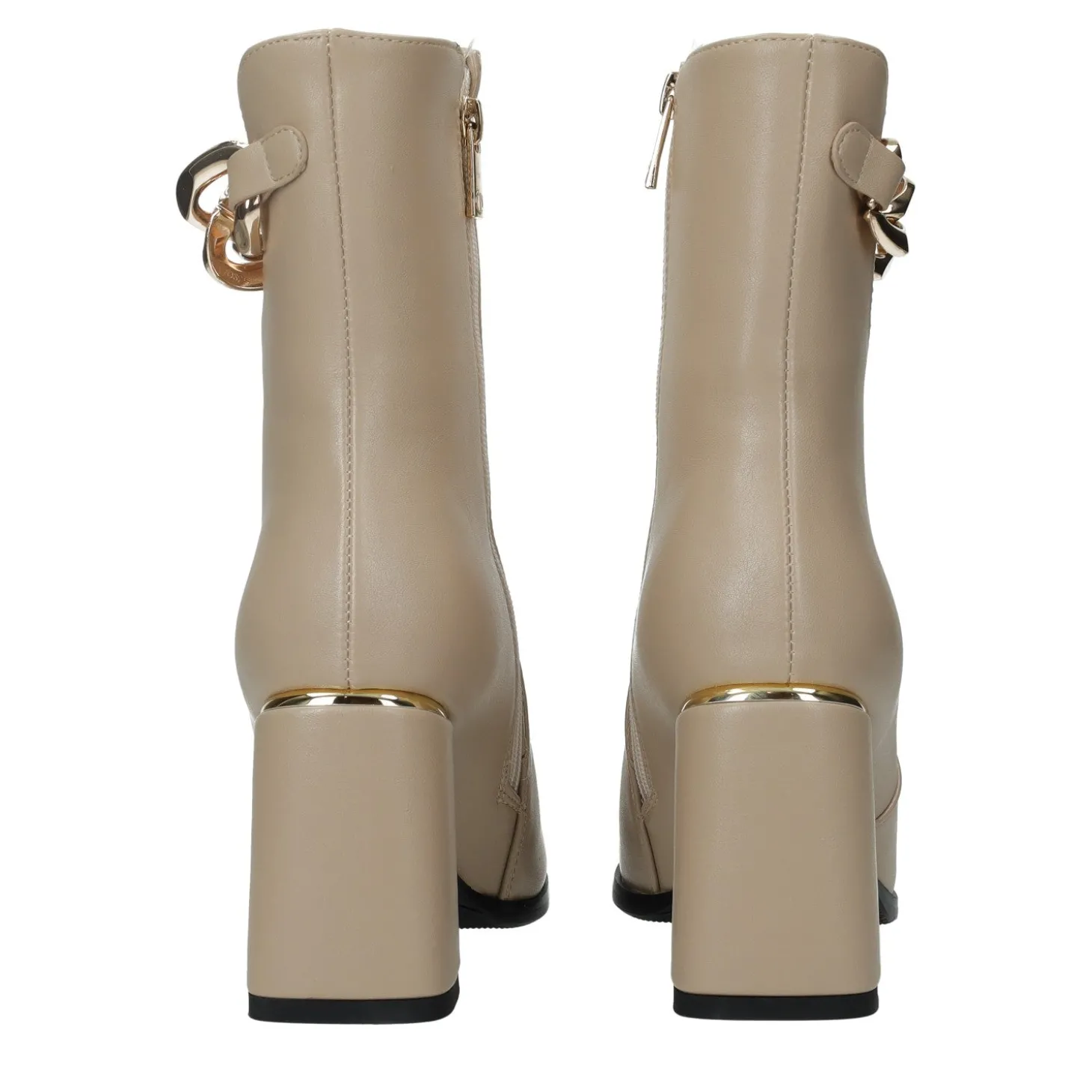 Gli stivaletti sono una scelta perfetta sia per dei look da giorno che da sera. Tacco chunky e dettaglio in catena.Chiusura con zip.Inserto metallizzato sul tacco.Altezza gambale: 18cmCirconferenza gambale: 28cmAltezza tacco: 8cm