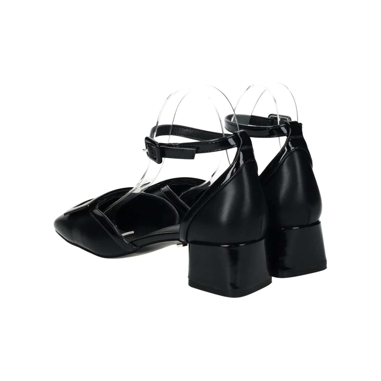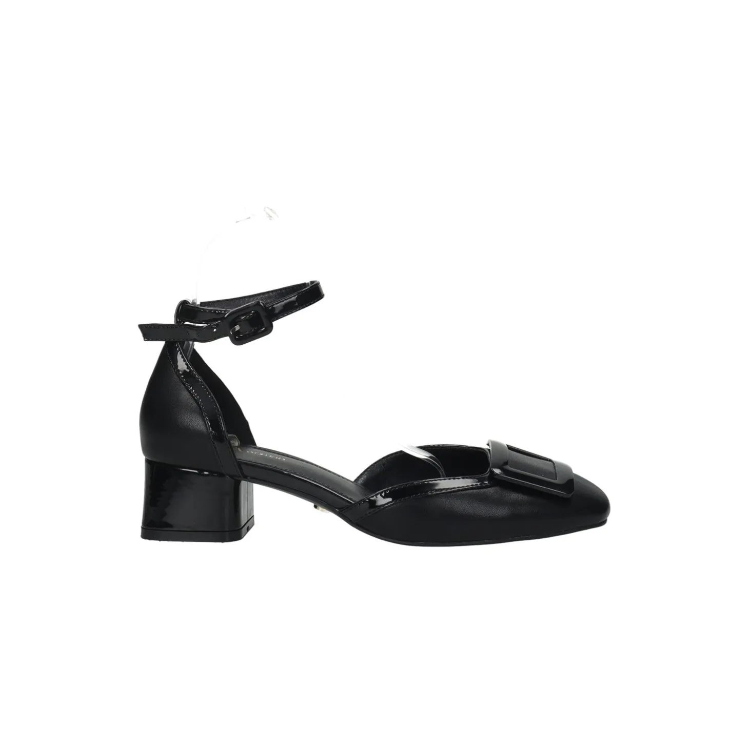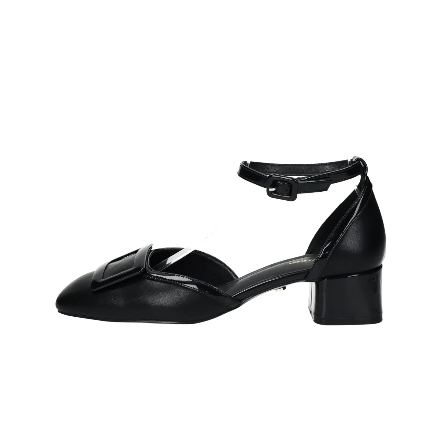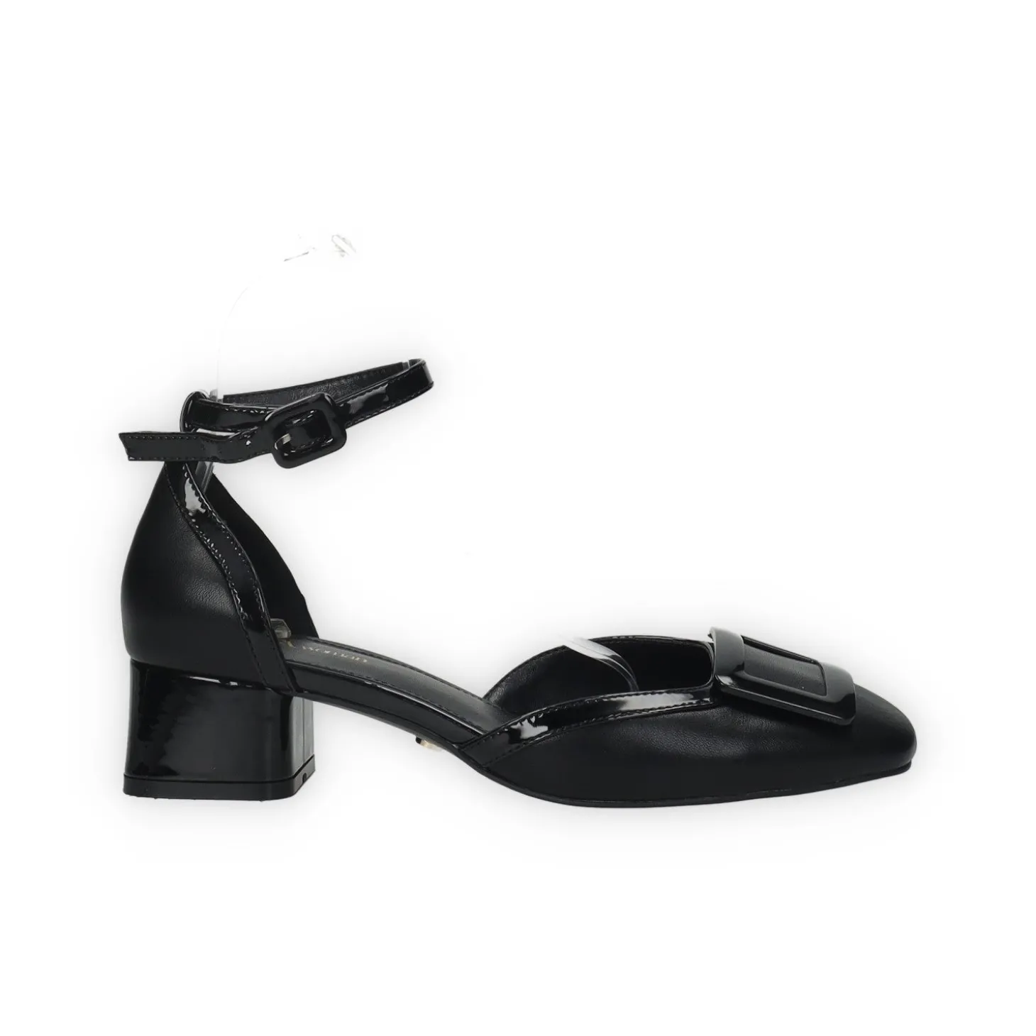 Décolleté con rifiniture in vernice. chiusura con fibbia alla caviglia e tacco alto 3.5cm