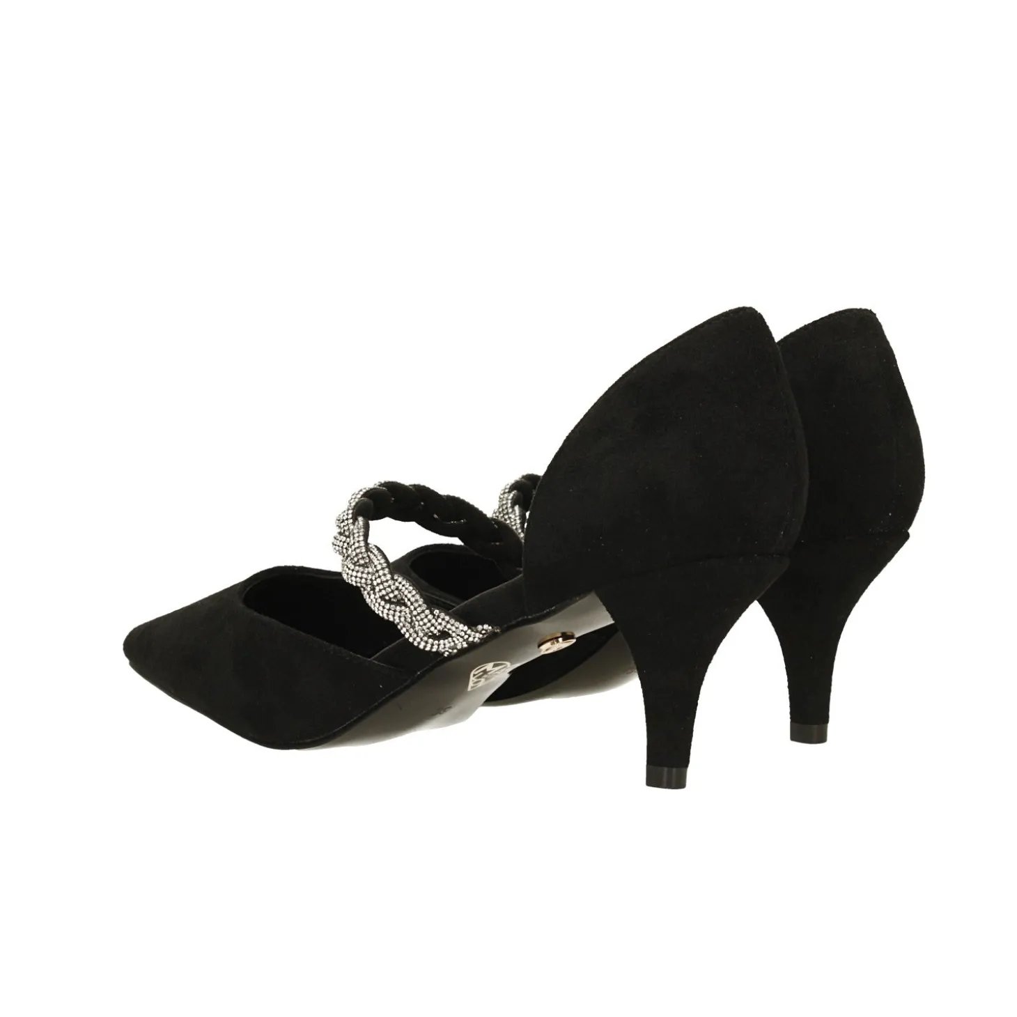 Décolleté a punta in microfibra.Tomaia aperta sui lati. Cinturino centrale intrecciato tempestato di strassAltezza tacco: 6cm