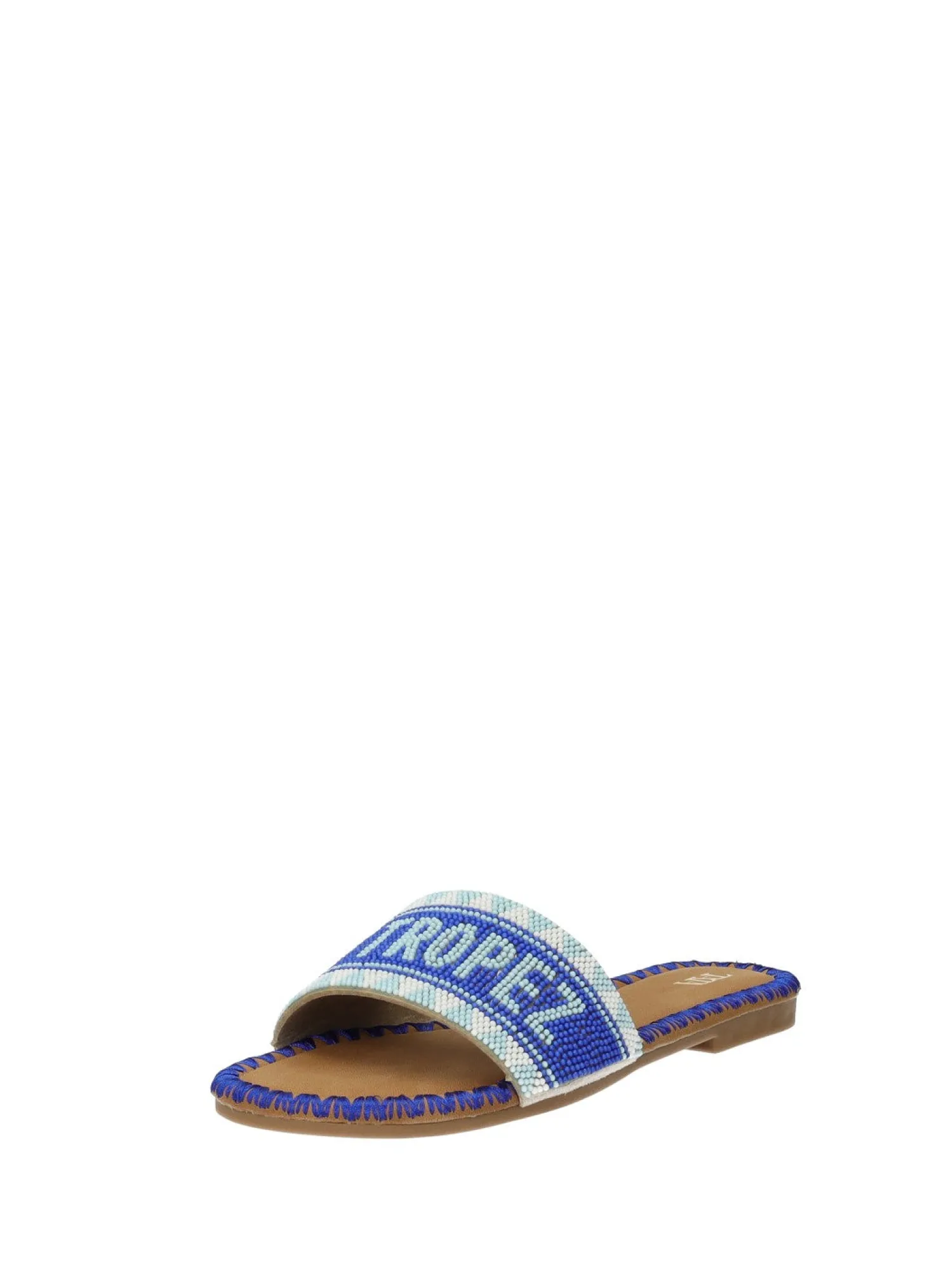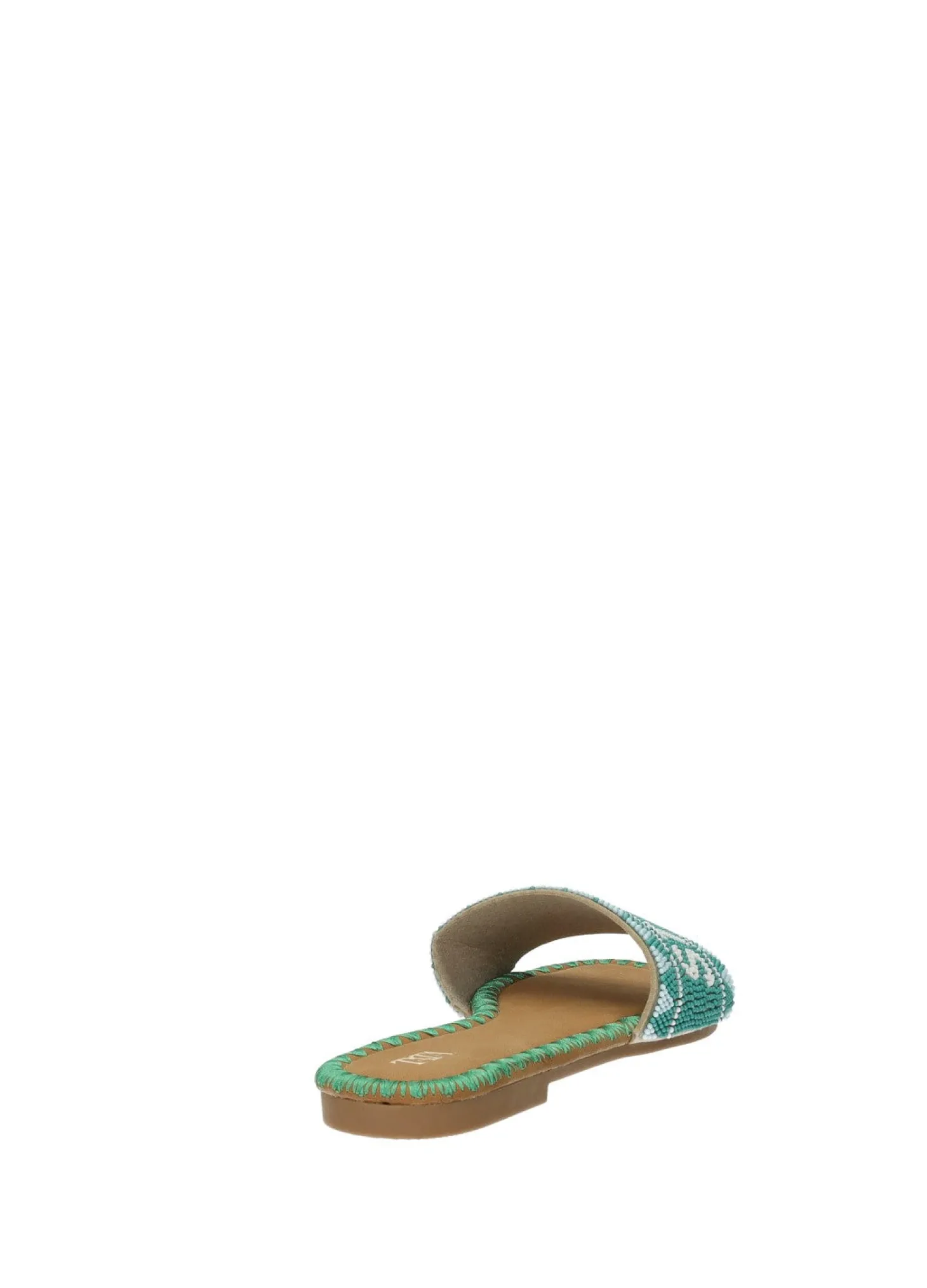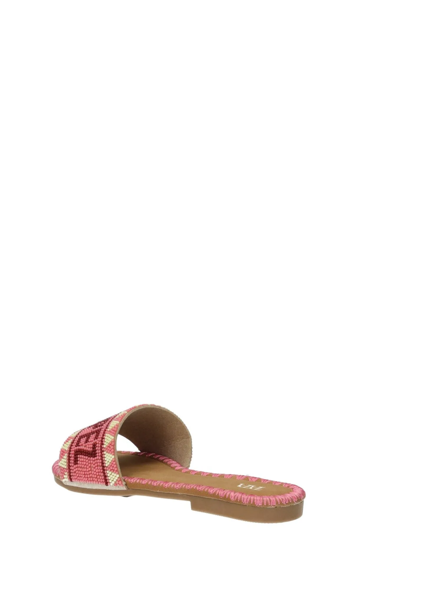 Sandali bassi con tomaia ricoperta di perline e fondo in gomma.ù