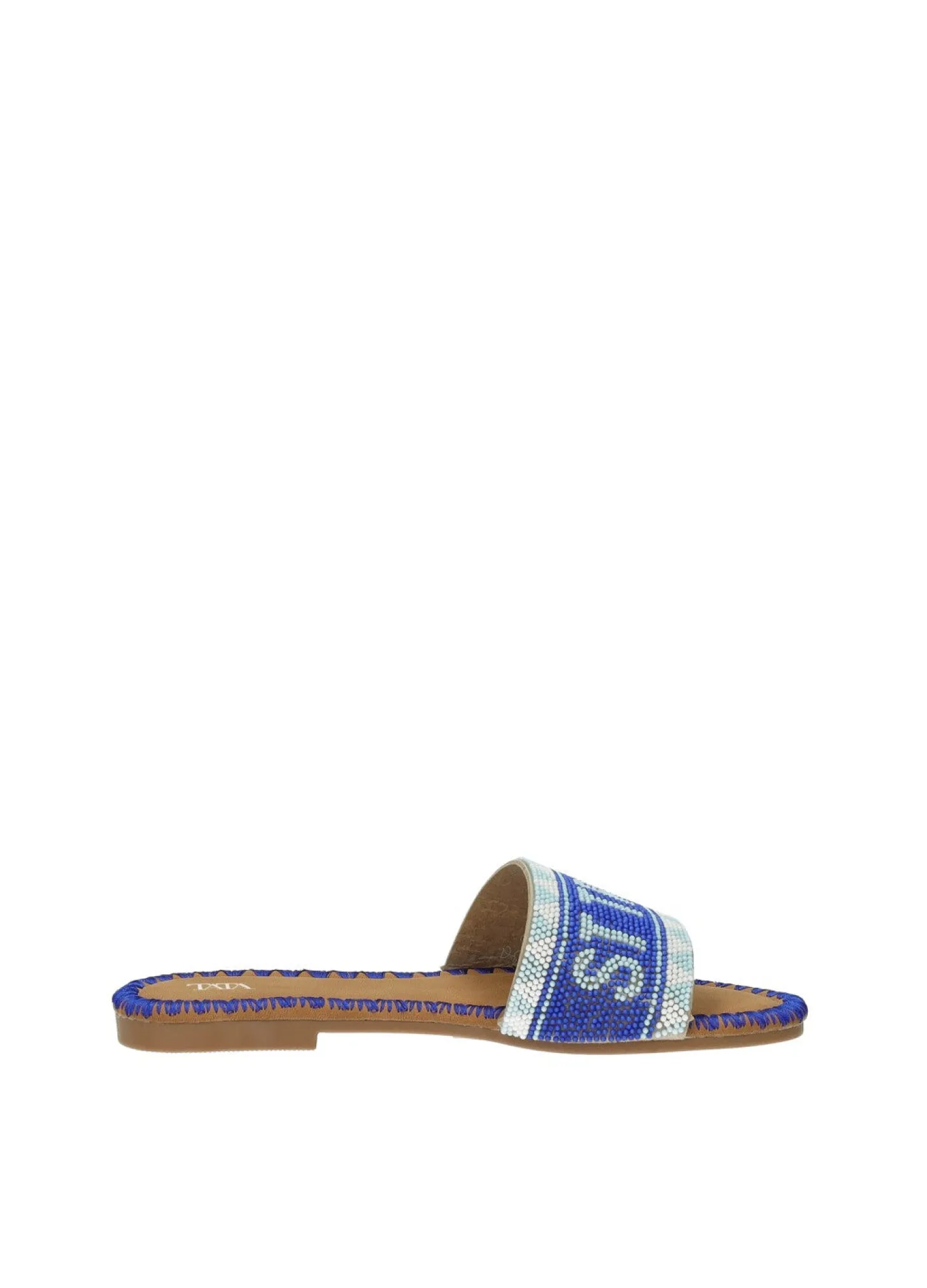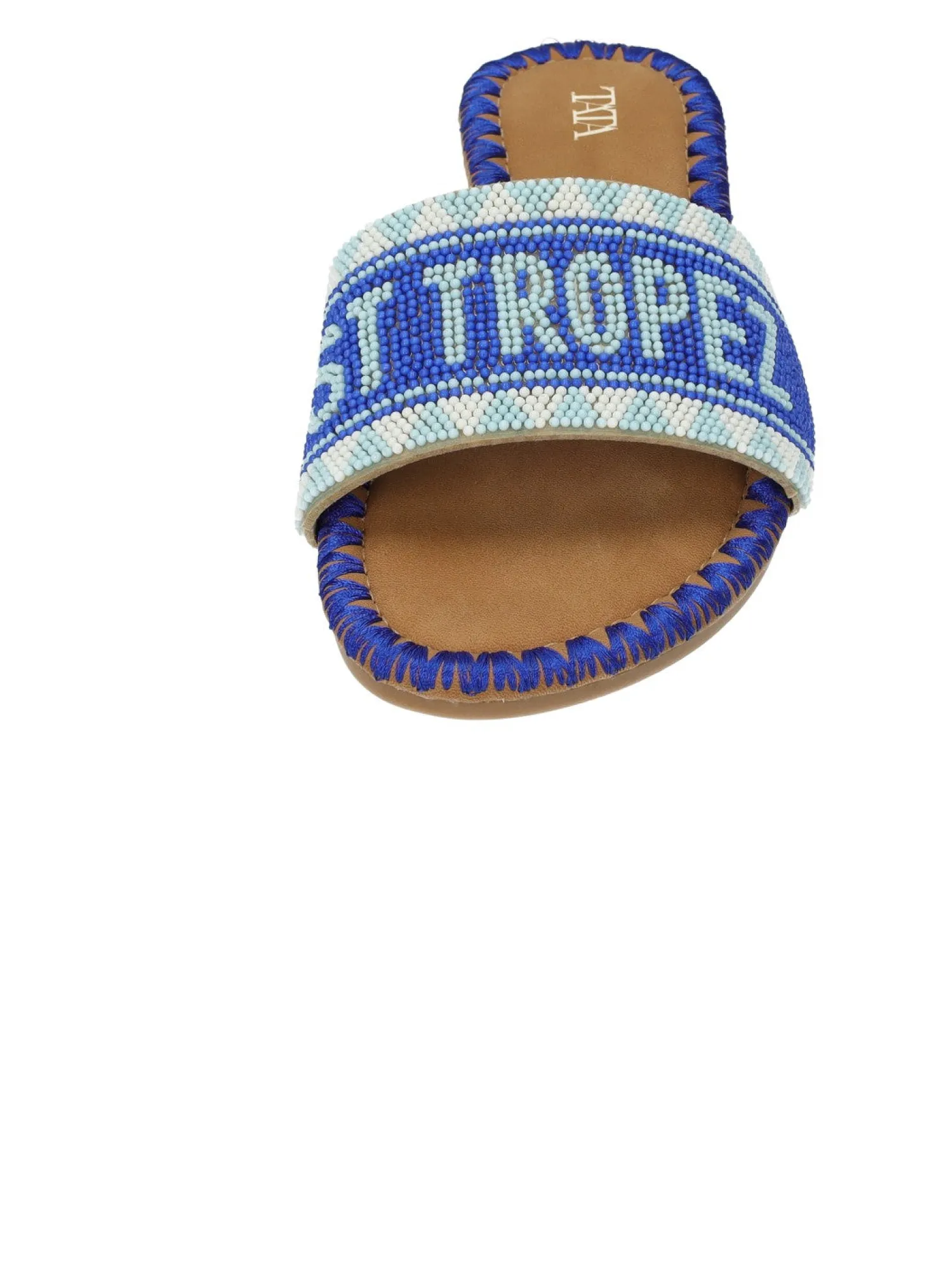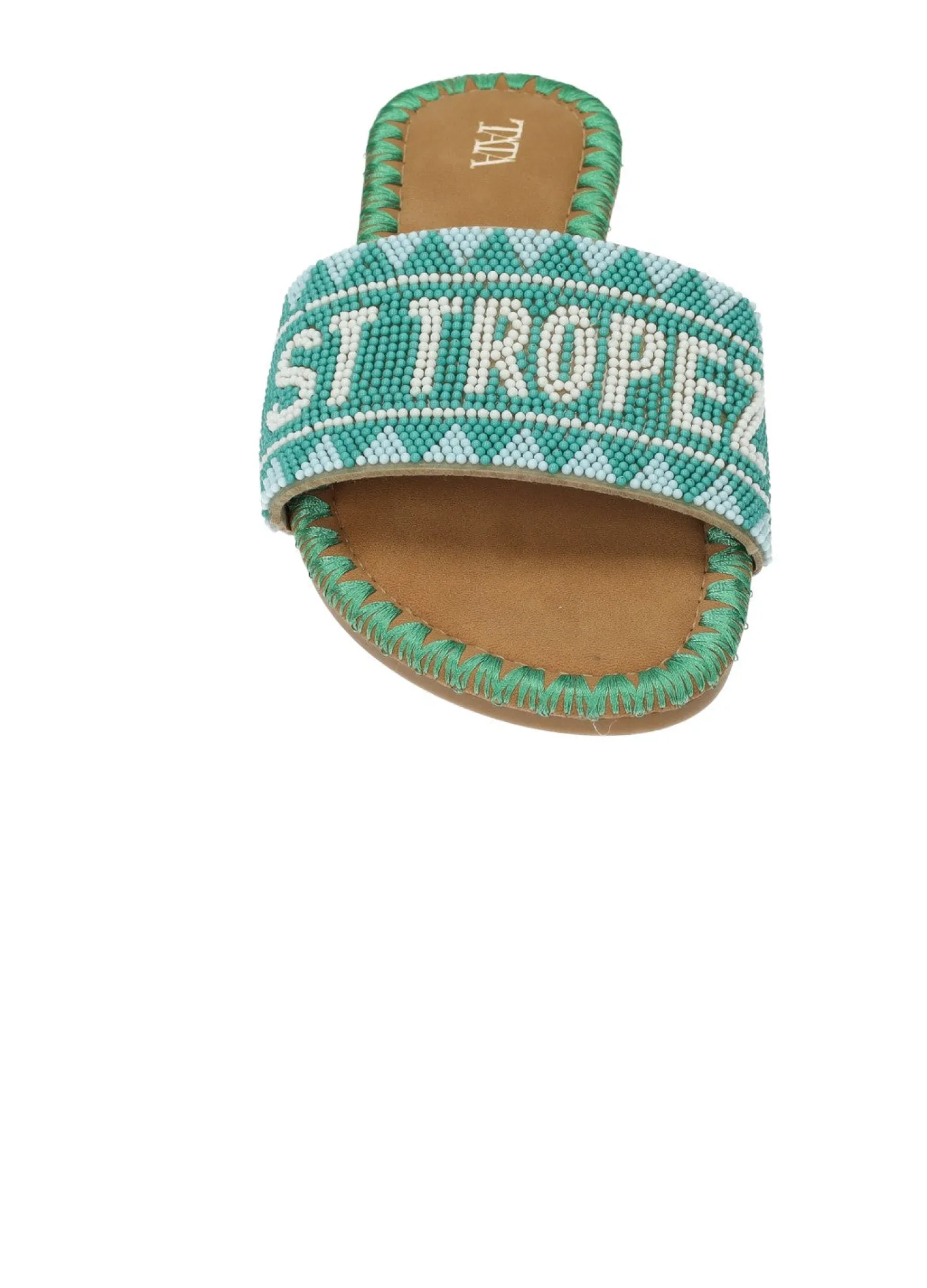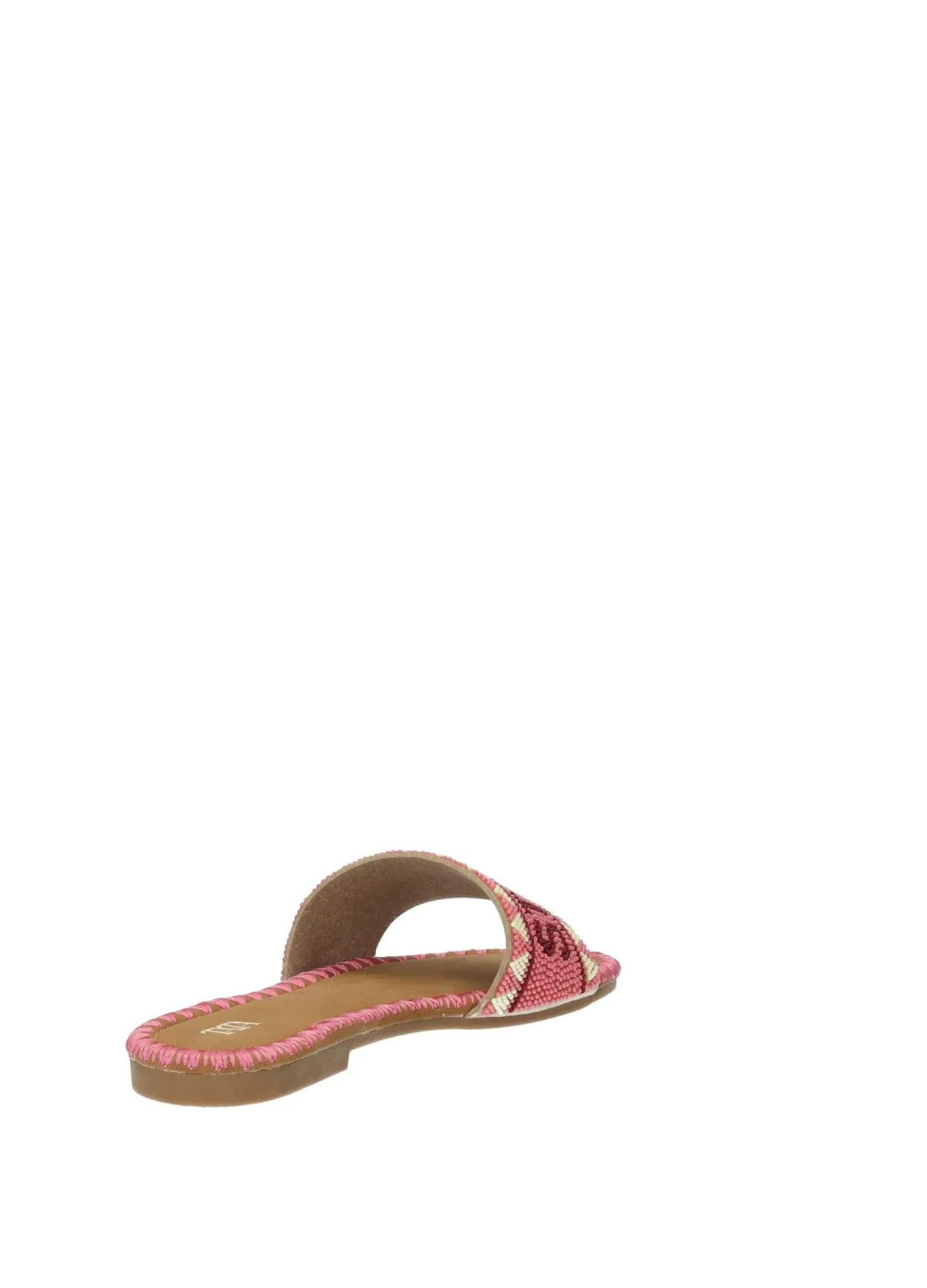 Sandali bassi con tomaia ricoperta di perline e fondo in gomma.ù