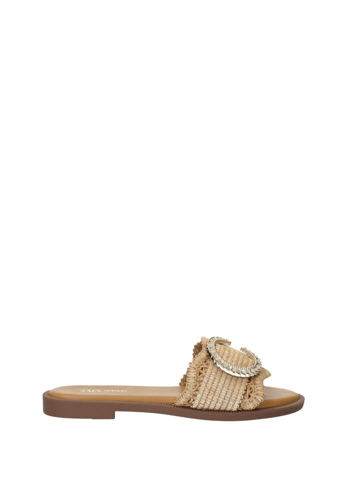 Sandali bassi con tomaia in rafia e dettaglio dorato.