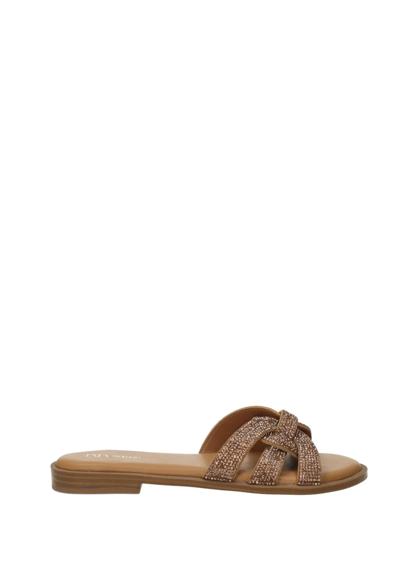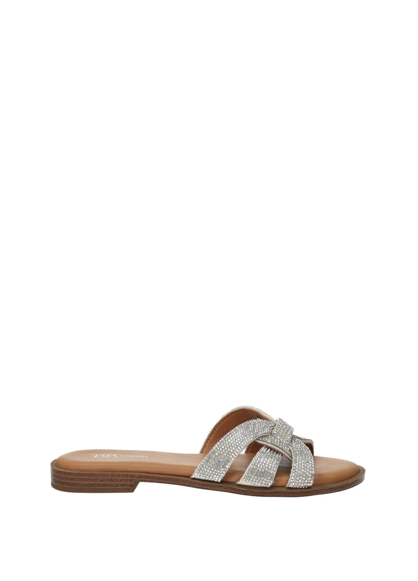 Sandali effetto pelle con tomaia ricoperta di strass e fondo in gomma.