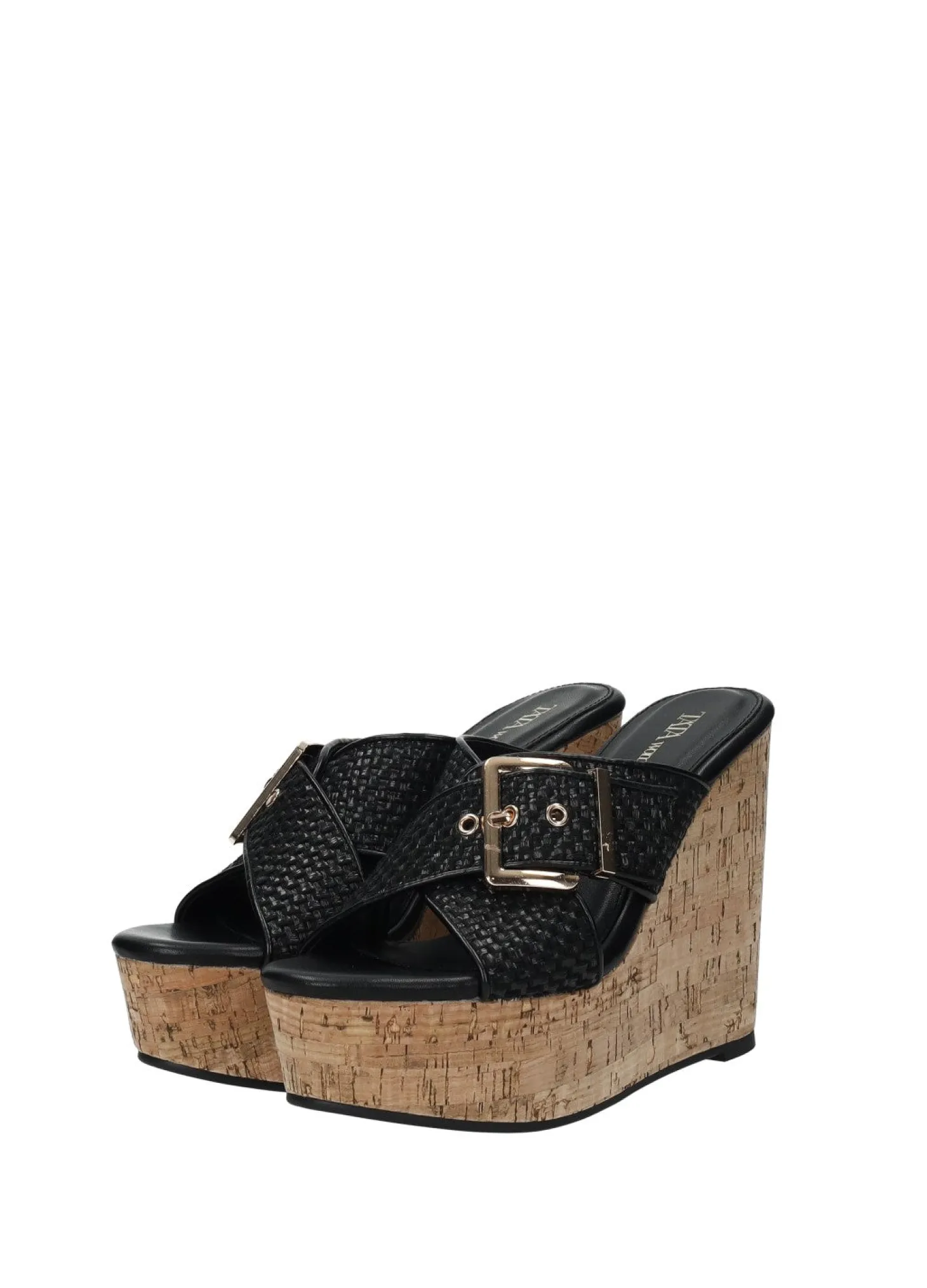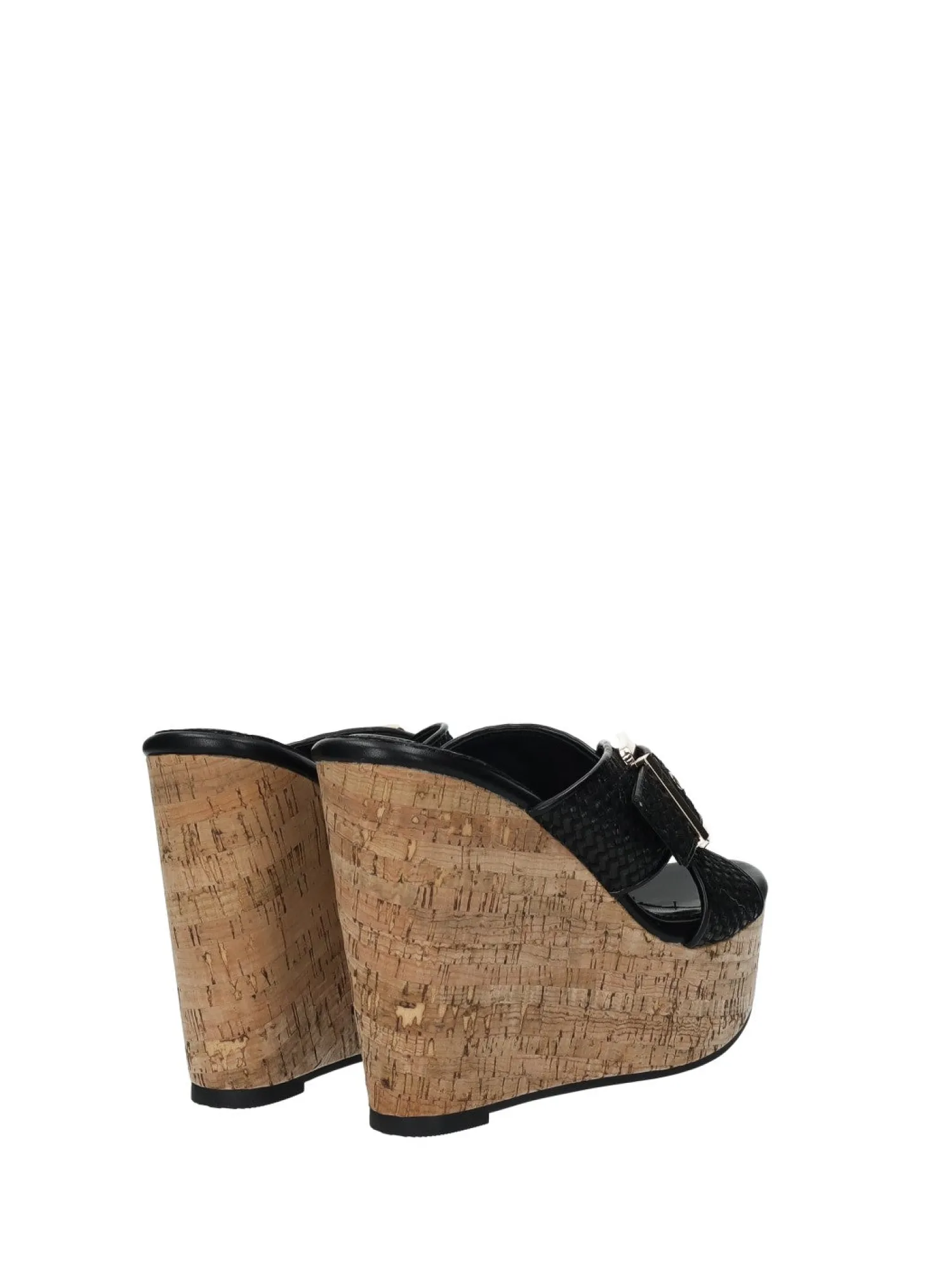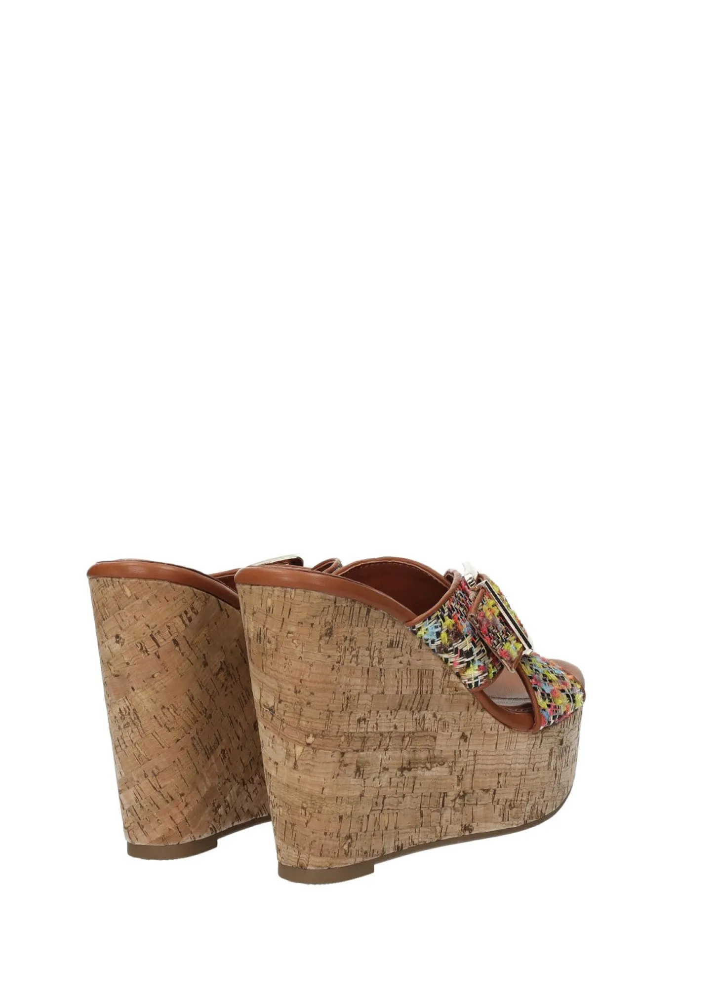 Sandali effetto pelle con fasce in rafia e zeppa di 12.5 cm.