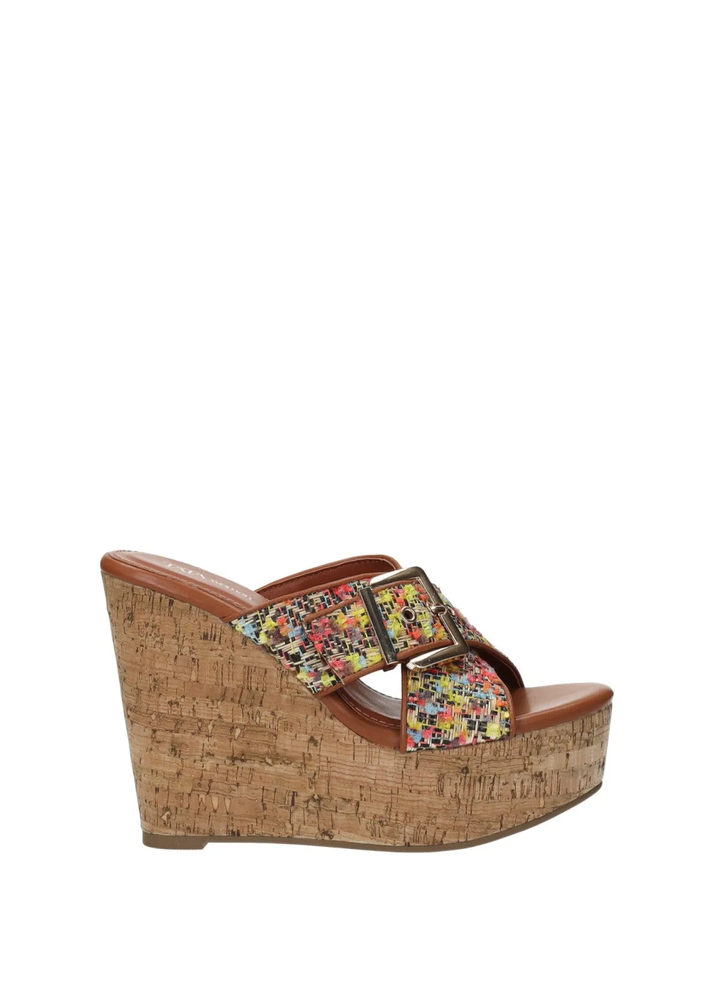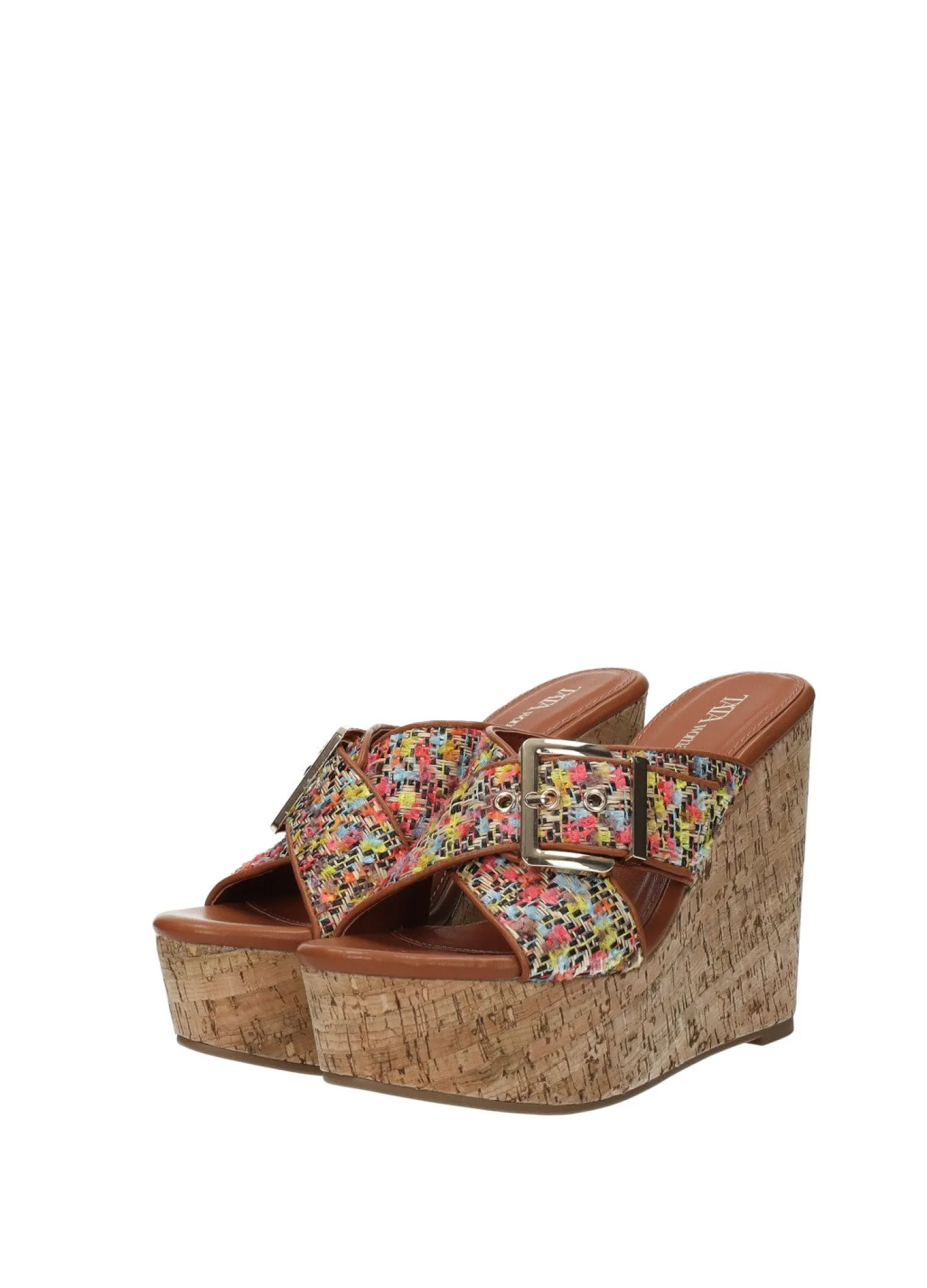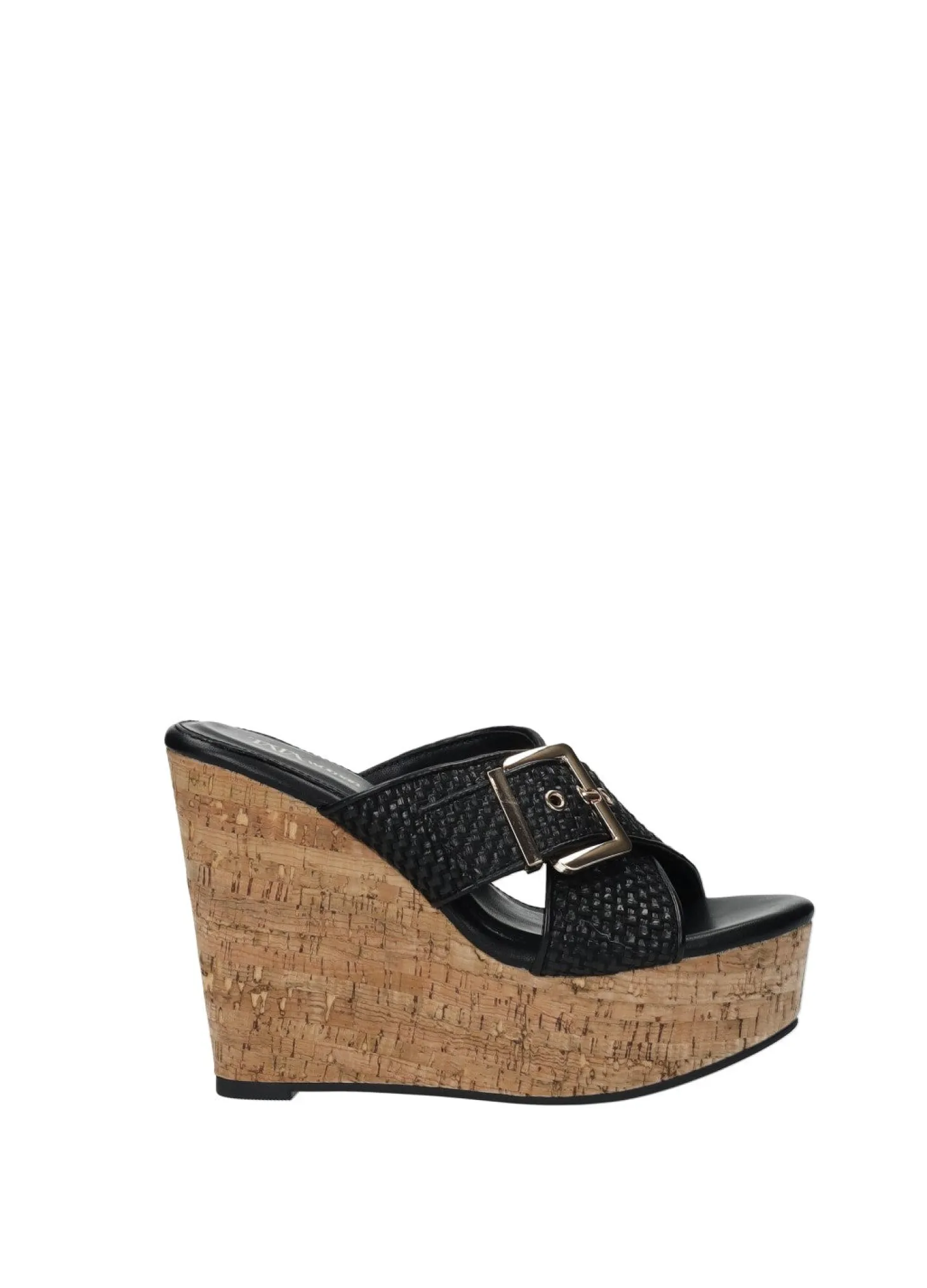Sandali effetto pelle con fasce in rafia e zeppa di 12.5 cm.