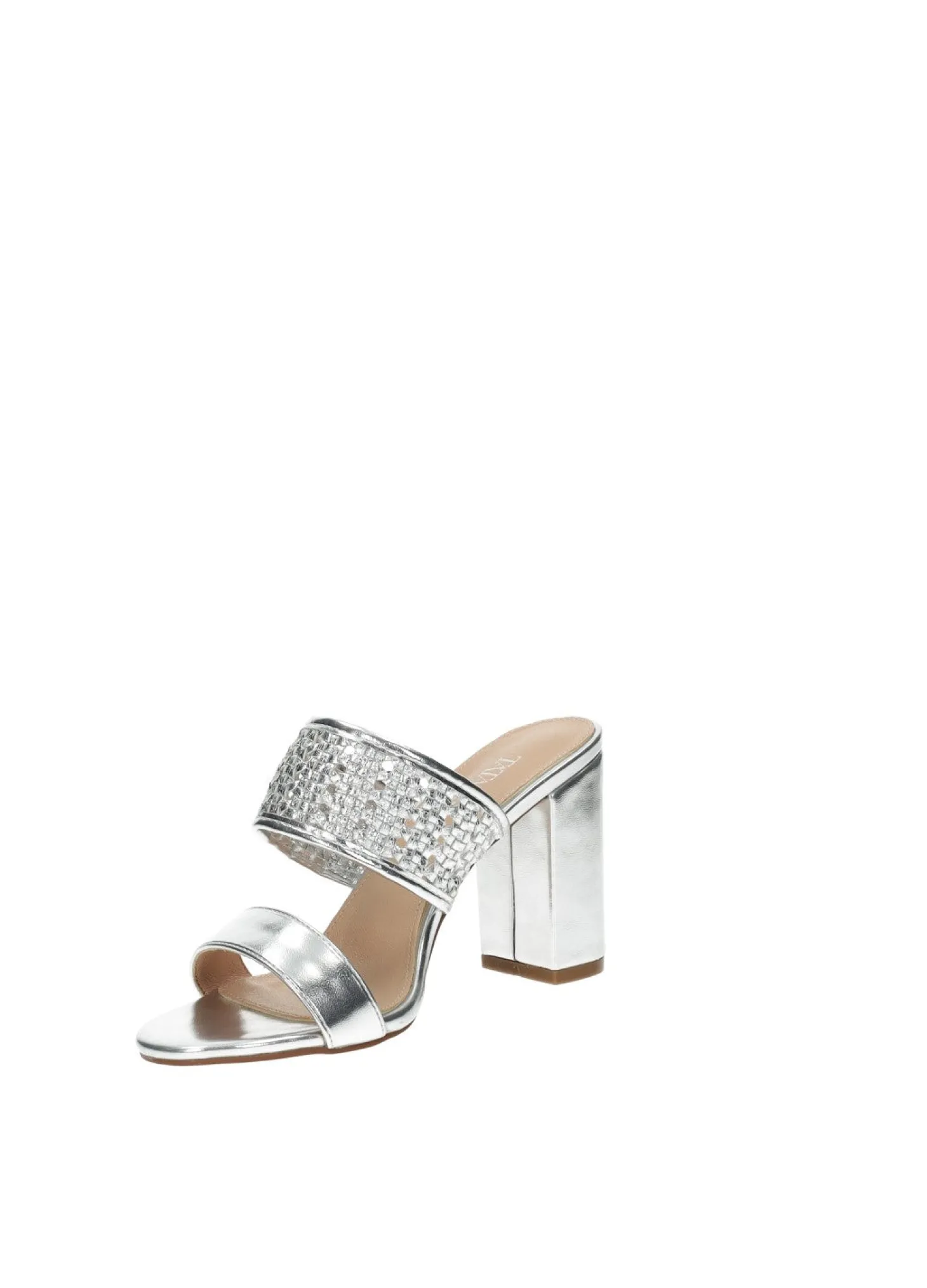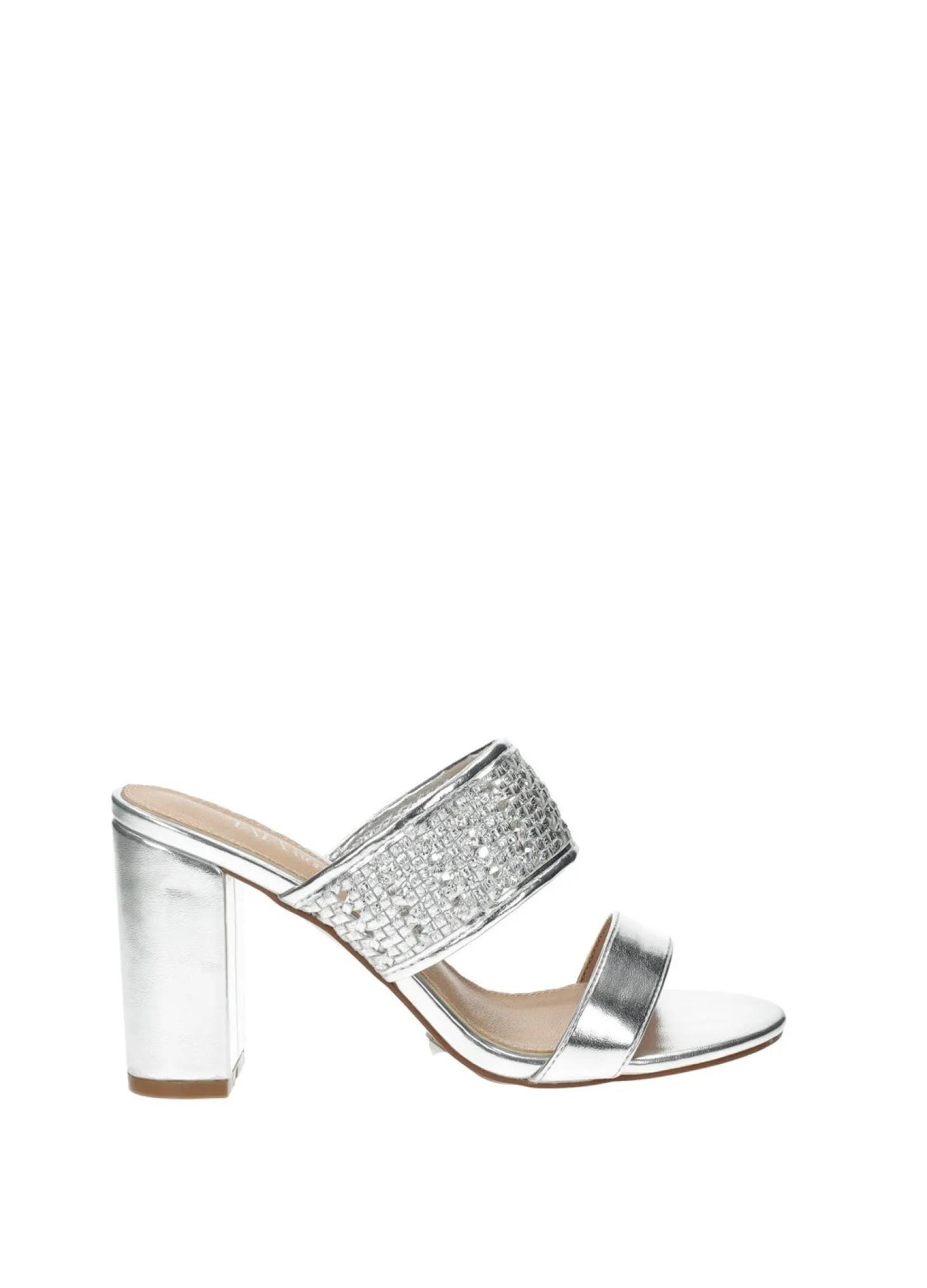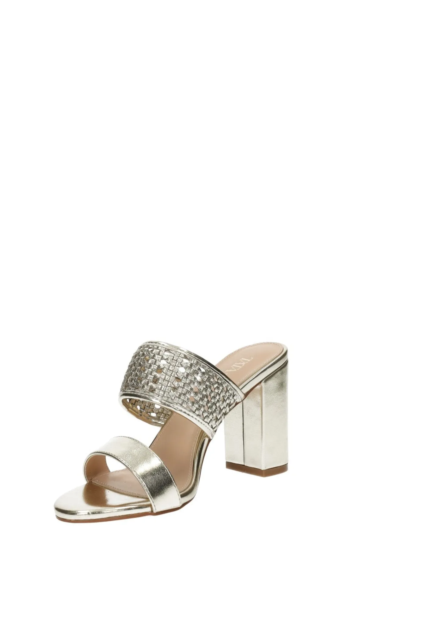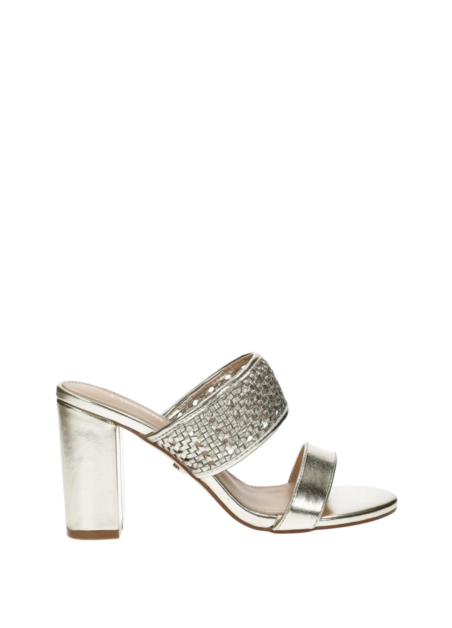 Sandali intrecciati laminati in ecopelle con tacco di 8.5 cm.