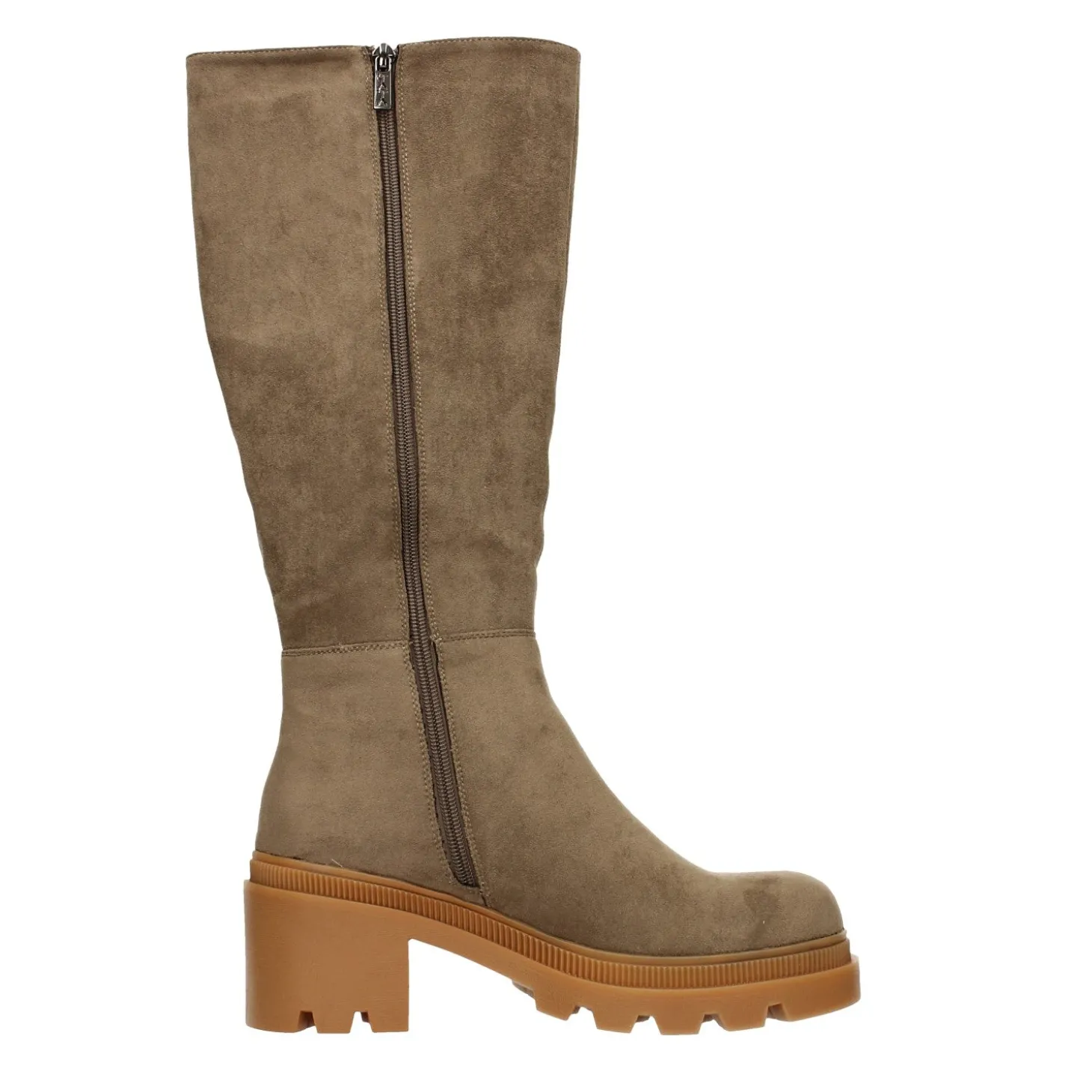 Stivali khaki con suola in gomma tassellata.Zip laterale interna.Altezza gambale: 37.5cmCirconferenza gambale: 39cmAltezza tacco: 6cm